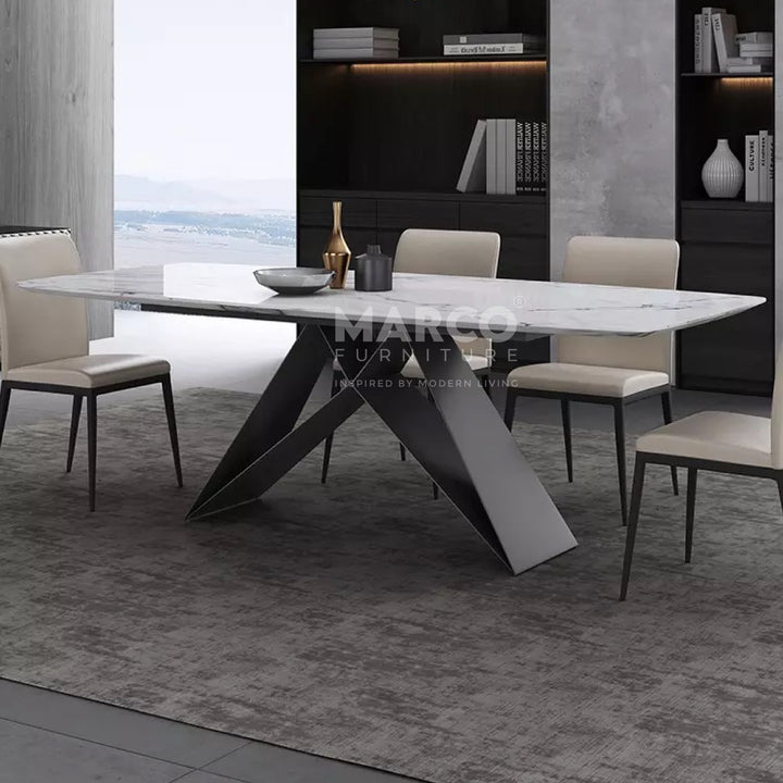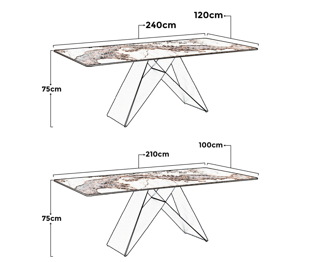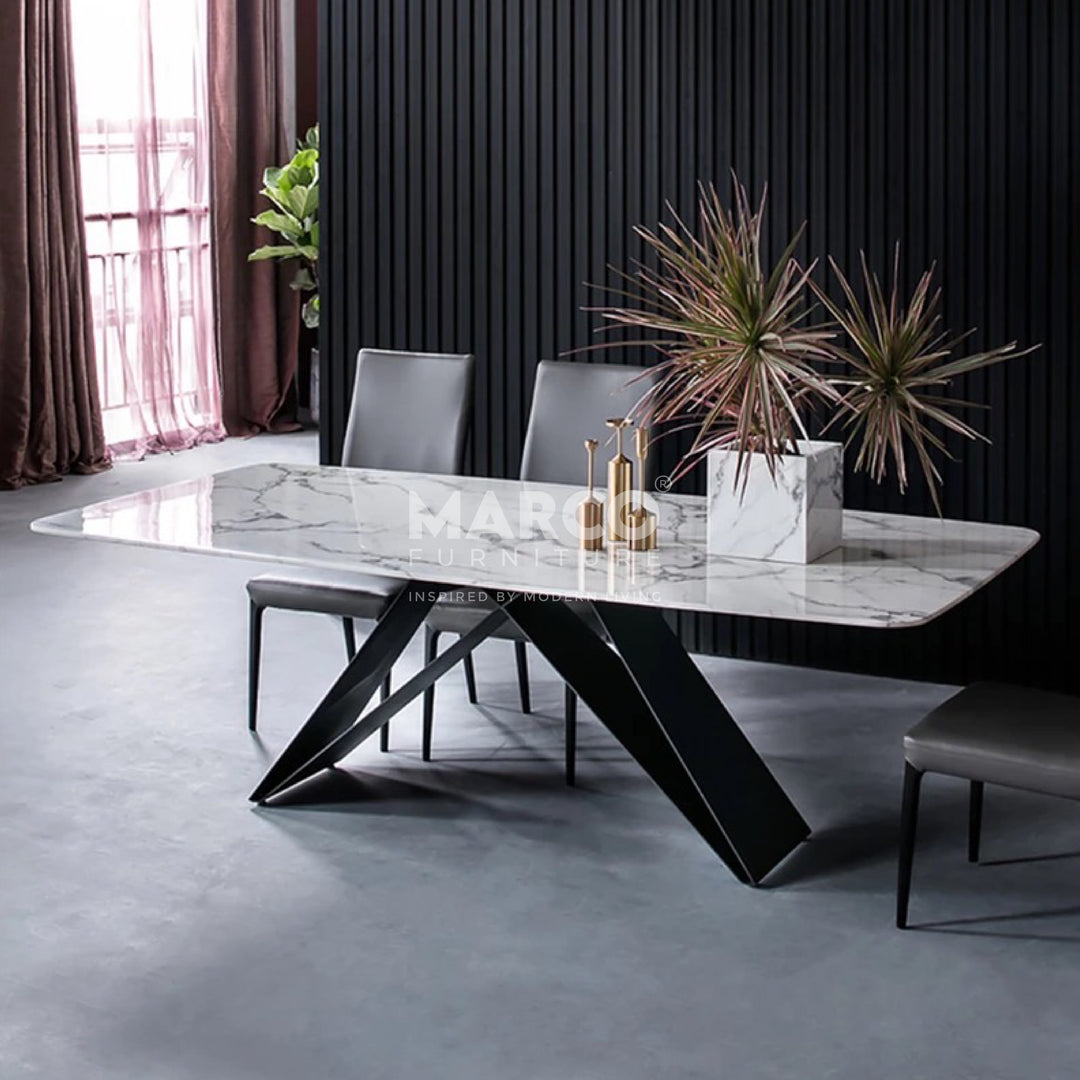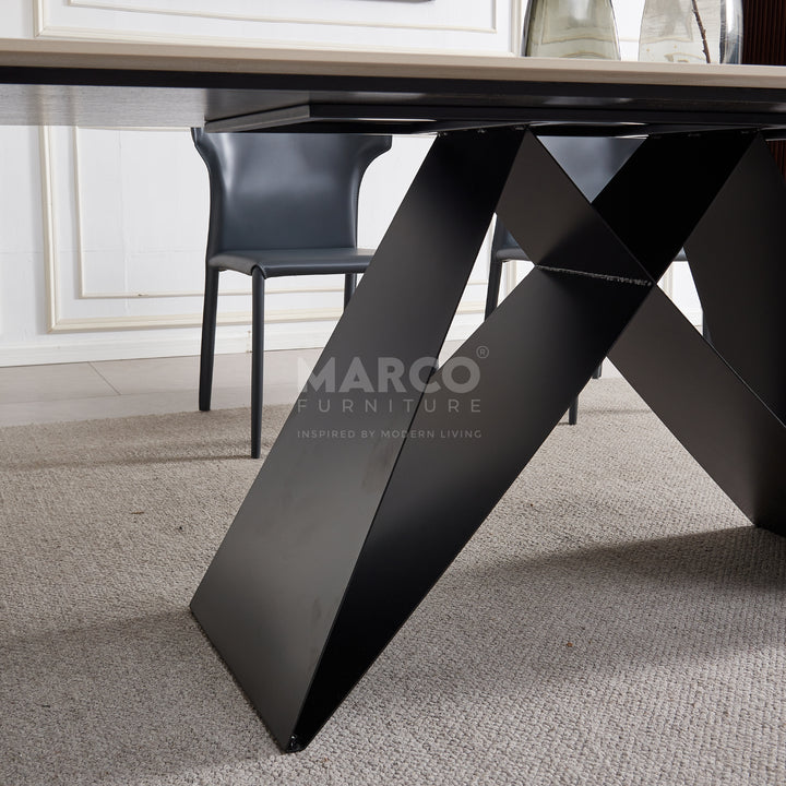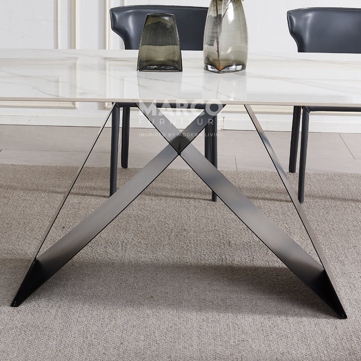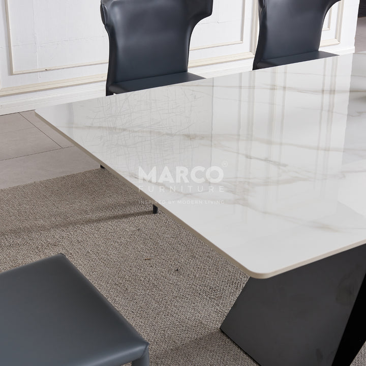 The Geneva Cattelan Style Dining Table comes in a beautiful cream-white ceramic top with natural brown veins. The gorgeous cut of ceramic serves as a spacious tabletop for everyday meals. The splayed designed base is made of metal, powder-coated in black for a matte finish. It’s perfectly suited for modern interiors and pairs beautifully with our comfortable dining chairs.