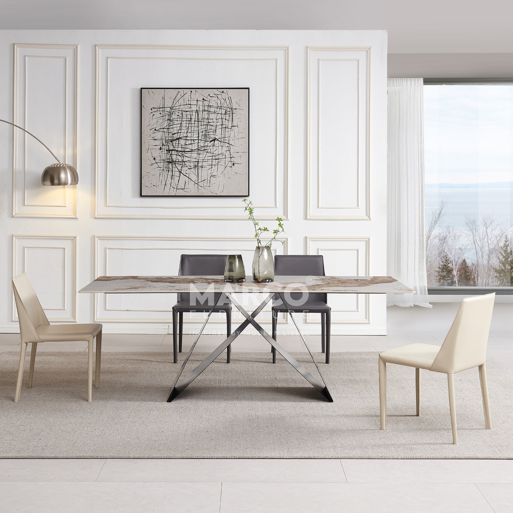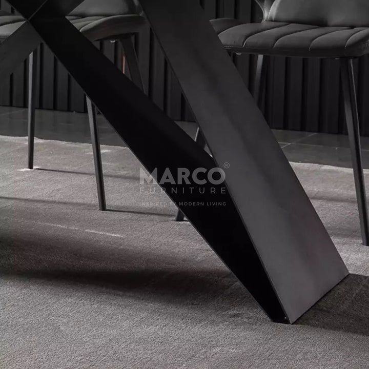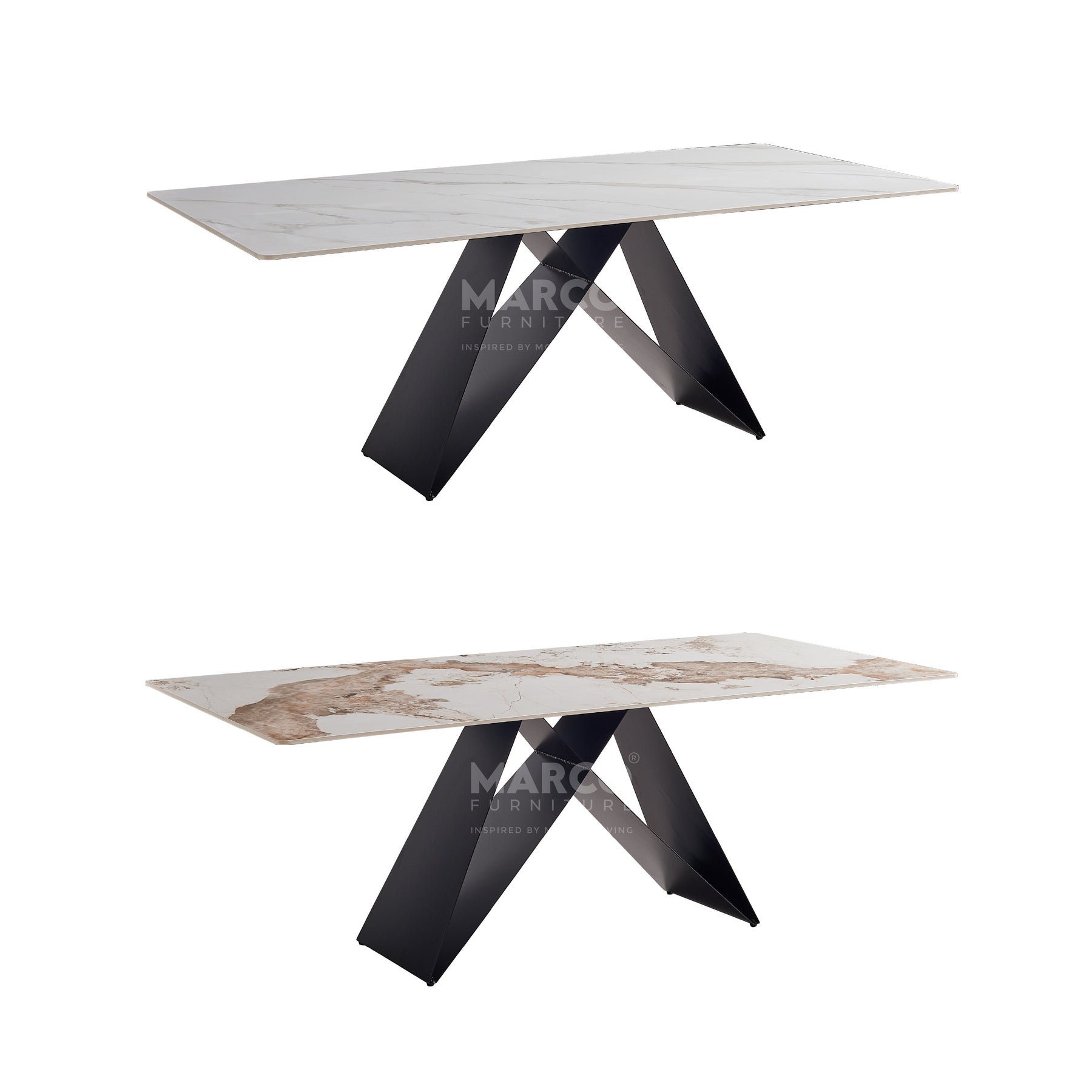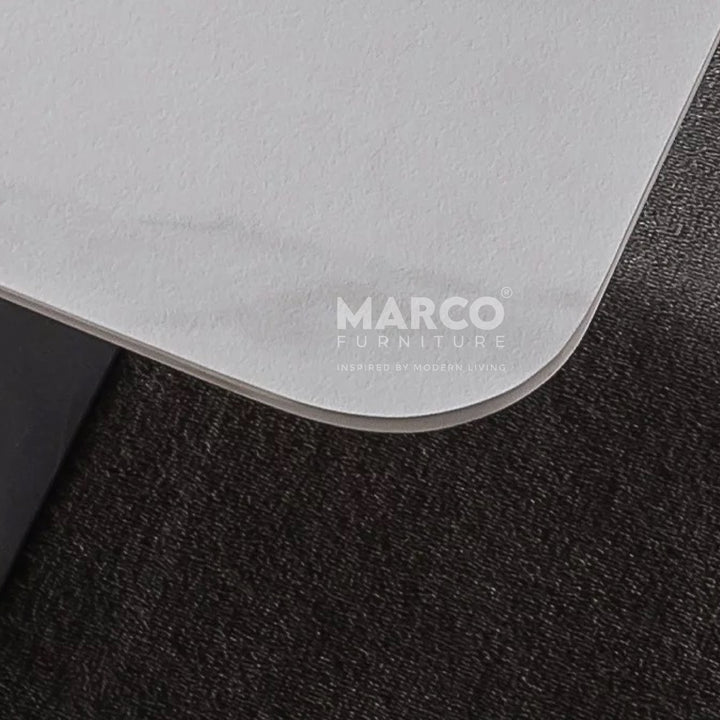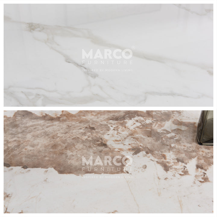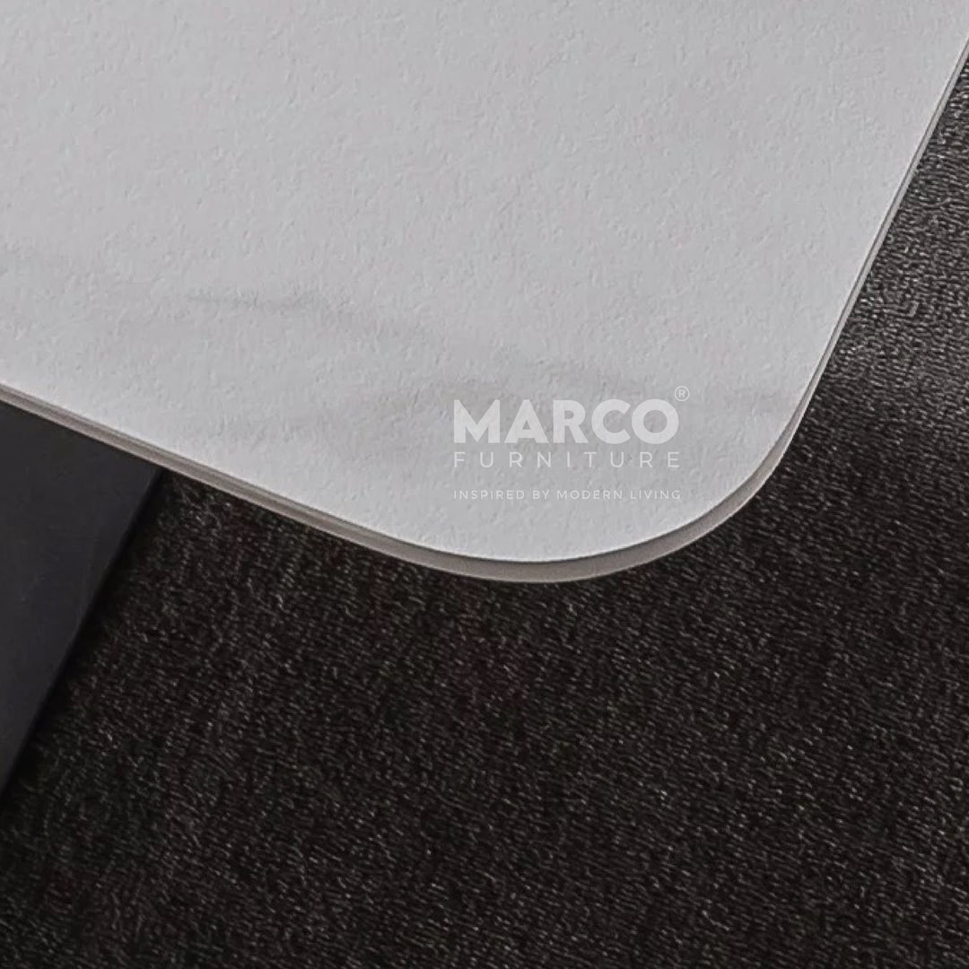 The Geneva Cattelan Style Dining Table comes in a beautiful cream-white ceramic top with natural brown veins. The gorgeous cut of ceramic serves as a spacious tabletop for everyday meals. The splayed designed base is made of metal, powder-coated in black for a matte finish. It’s perfectly suited for modern interiors and pairs beautifully with our comfortable dining chairs.