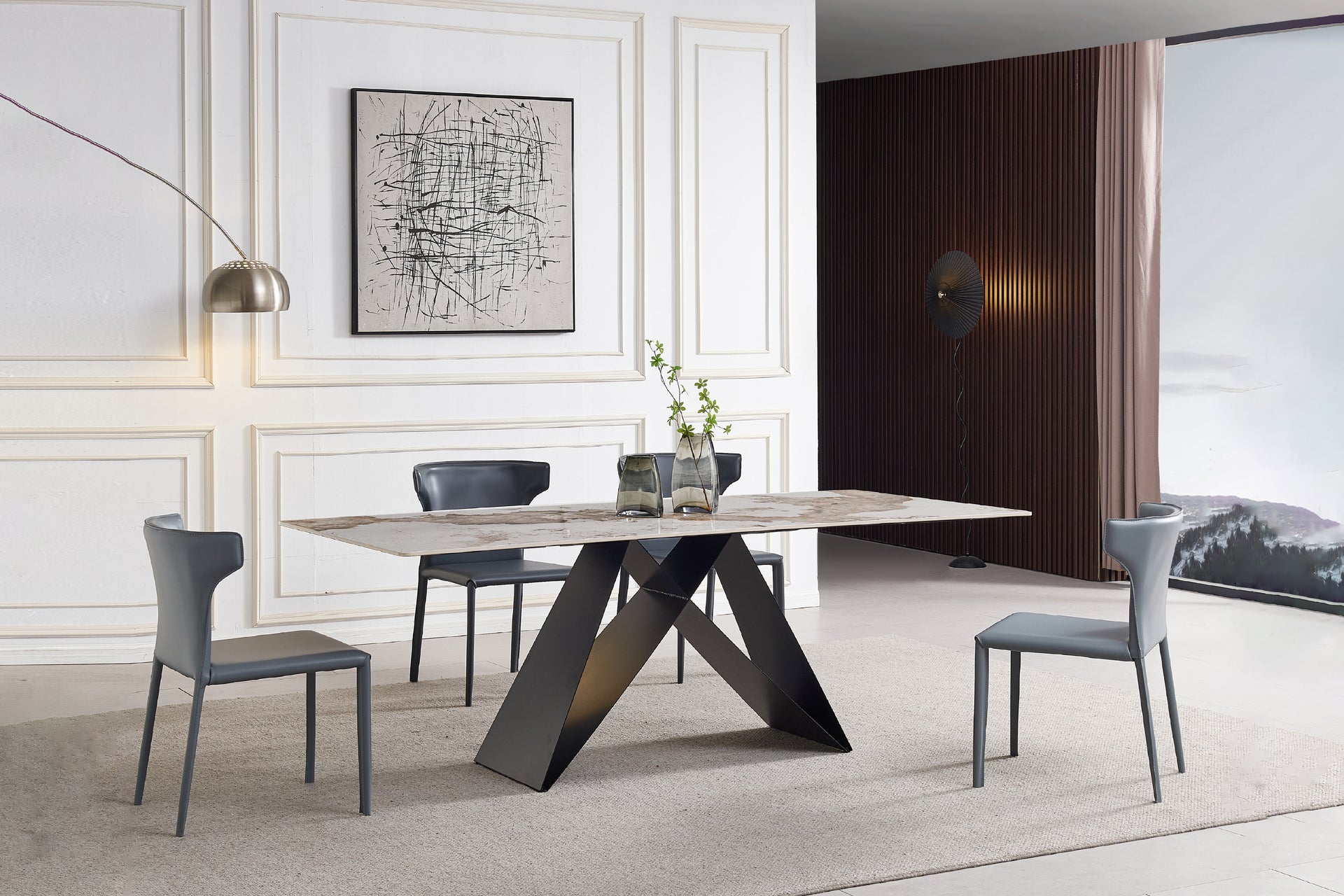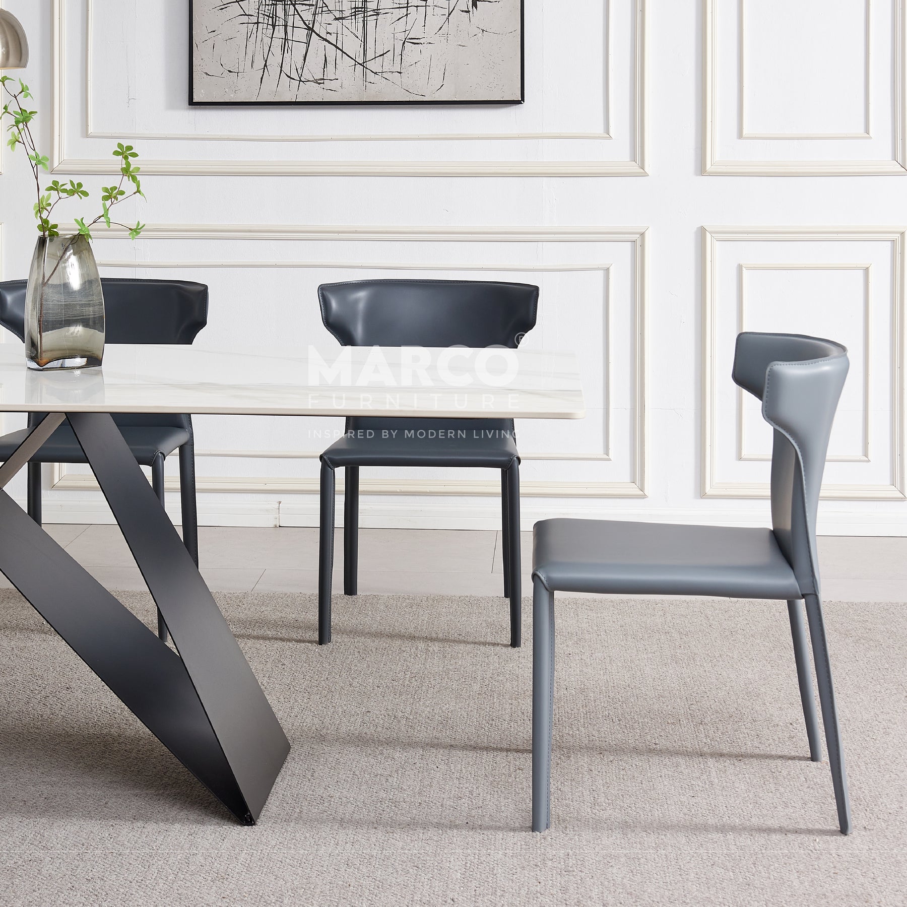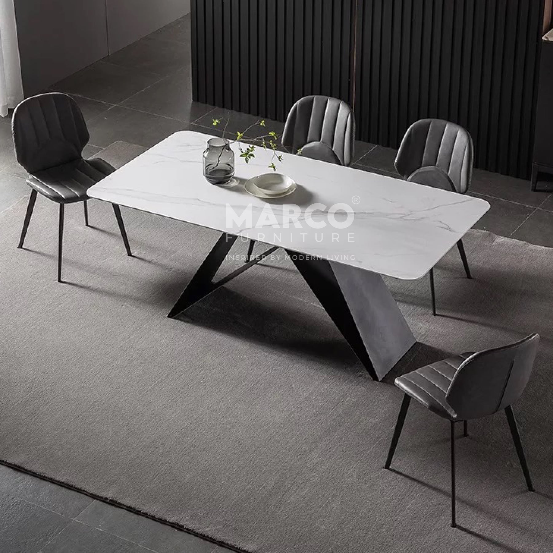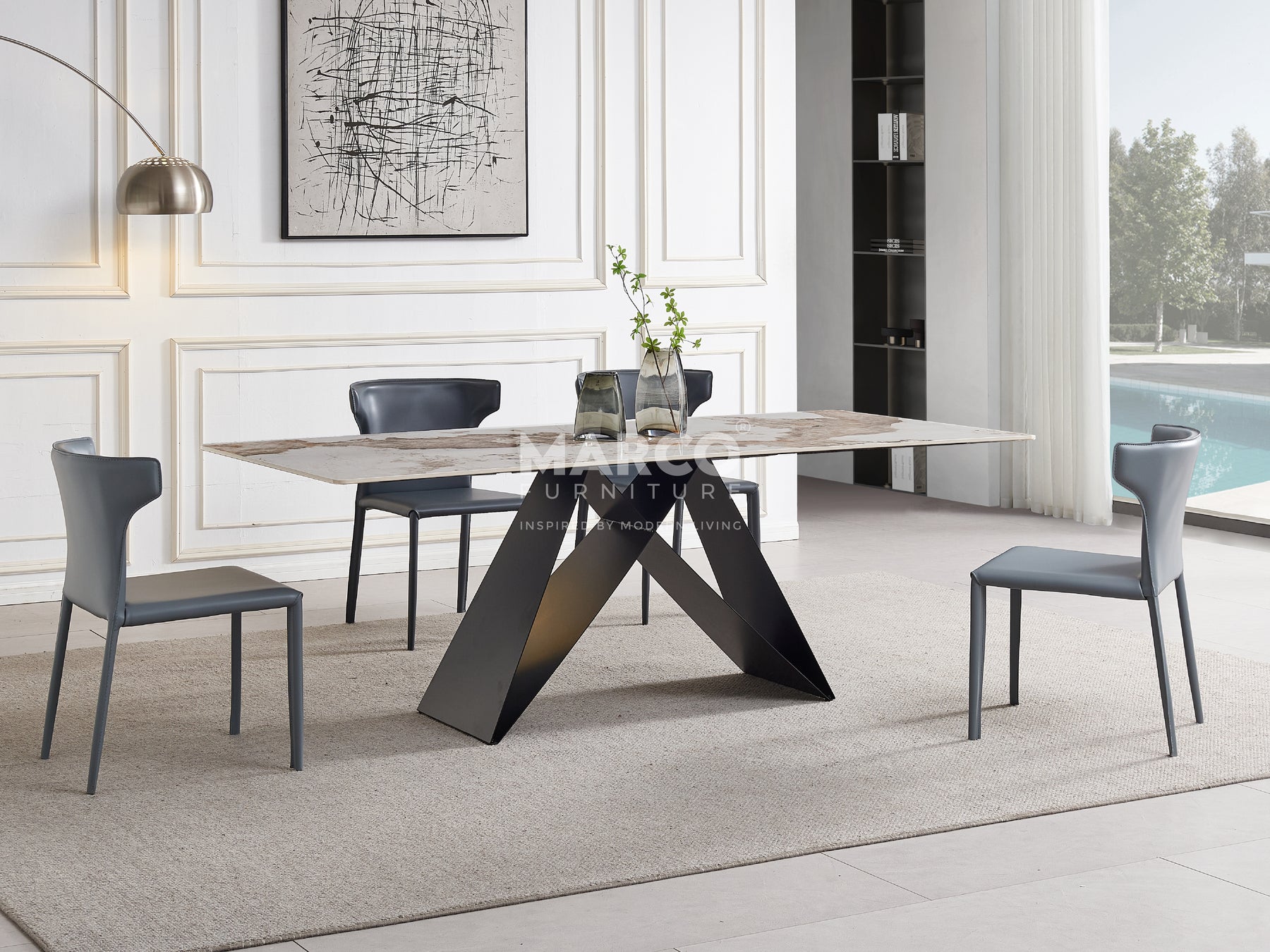 The Geneva Cattelan Style Dining Table comes in a beautiful cream-white ceramic top with natural brown veins. The gorgeous cut of ceramic serves as a spacious tabletop for everyday meals. The splayed designed base is made of metal, powder-coated in black for a matte finish. It’s perfectly suited for modern interiors and pairs beautifully with our comfortable dining chairs.