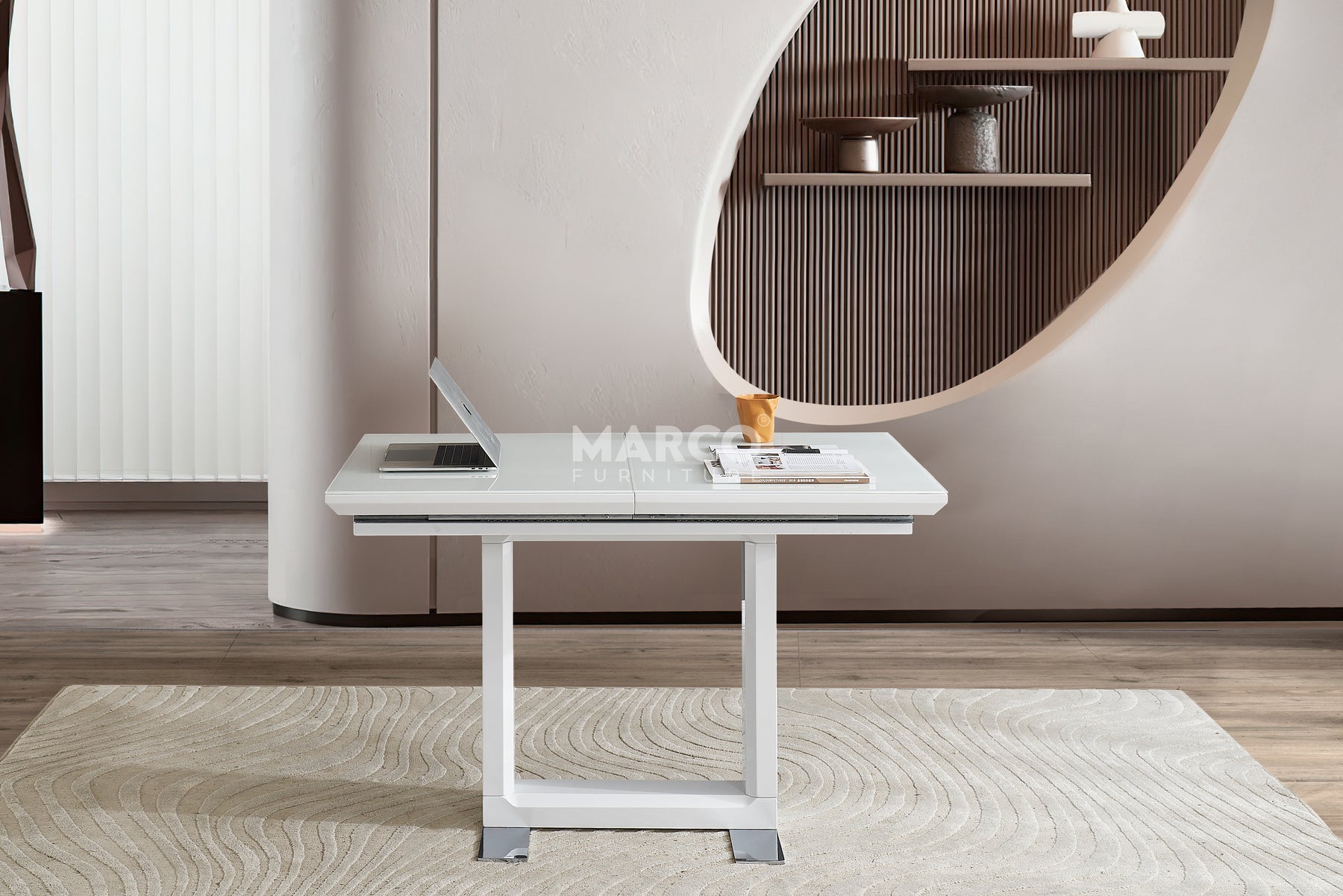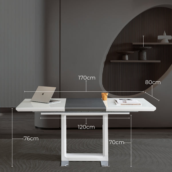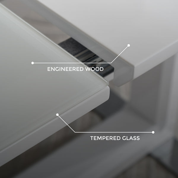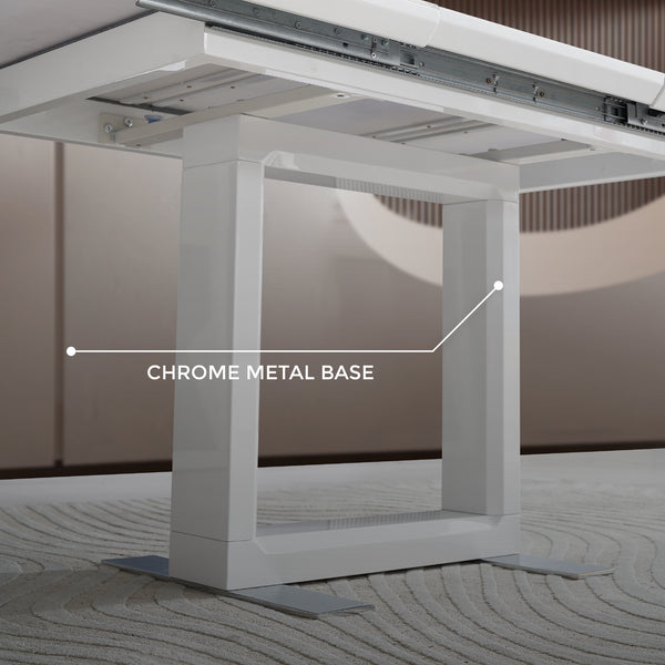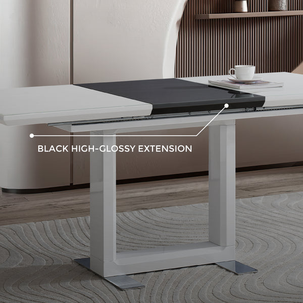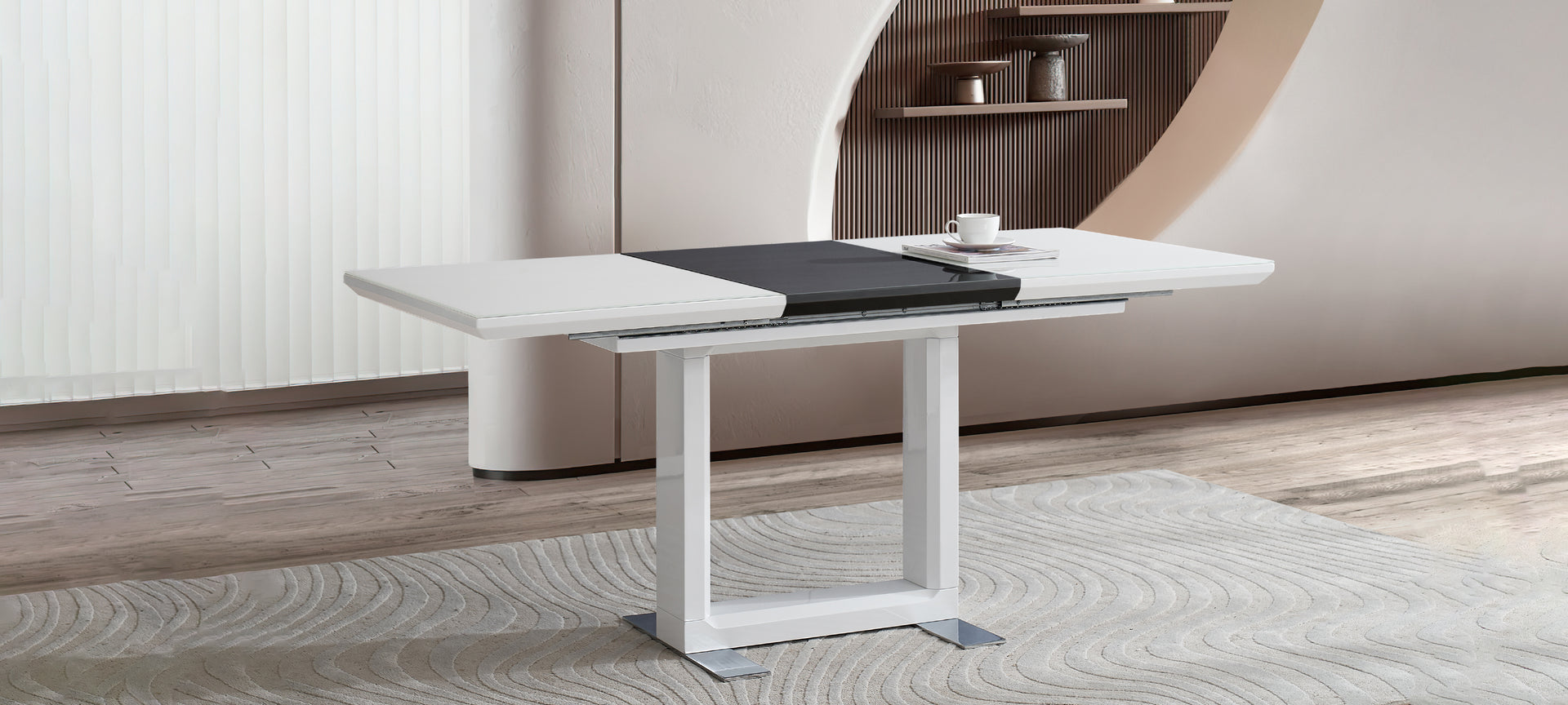 The Lacy Black & White Extendable Dining Table features an engineered wood top with a sleek white high-gloss finish, offering a smooth, polished surface. On either side of the top, 5mm snow-white tempered glass adds a visual contrast. The extension piece is finished in black high gloss, perfectly complementing the rest of the design. Supported by chrome metal legs, this table exudes contemporary style and is ideal for any dining space.