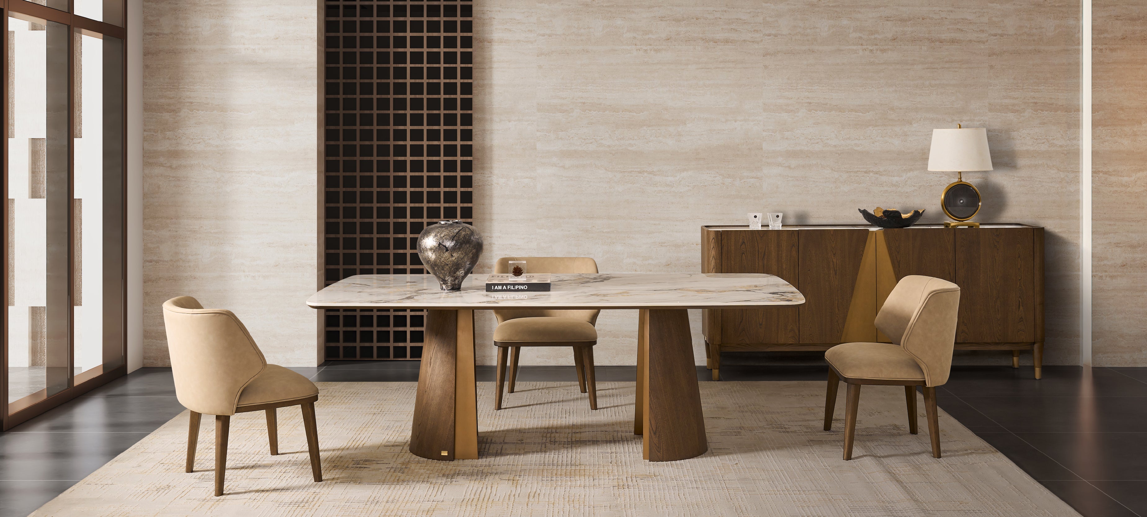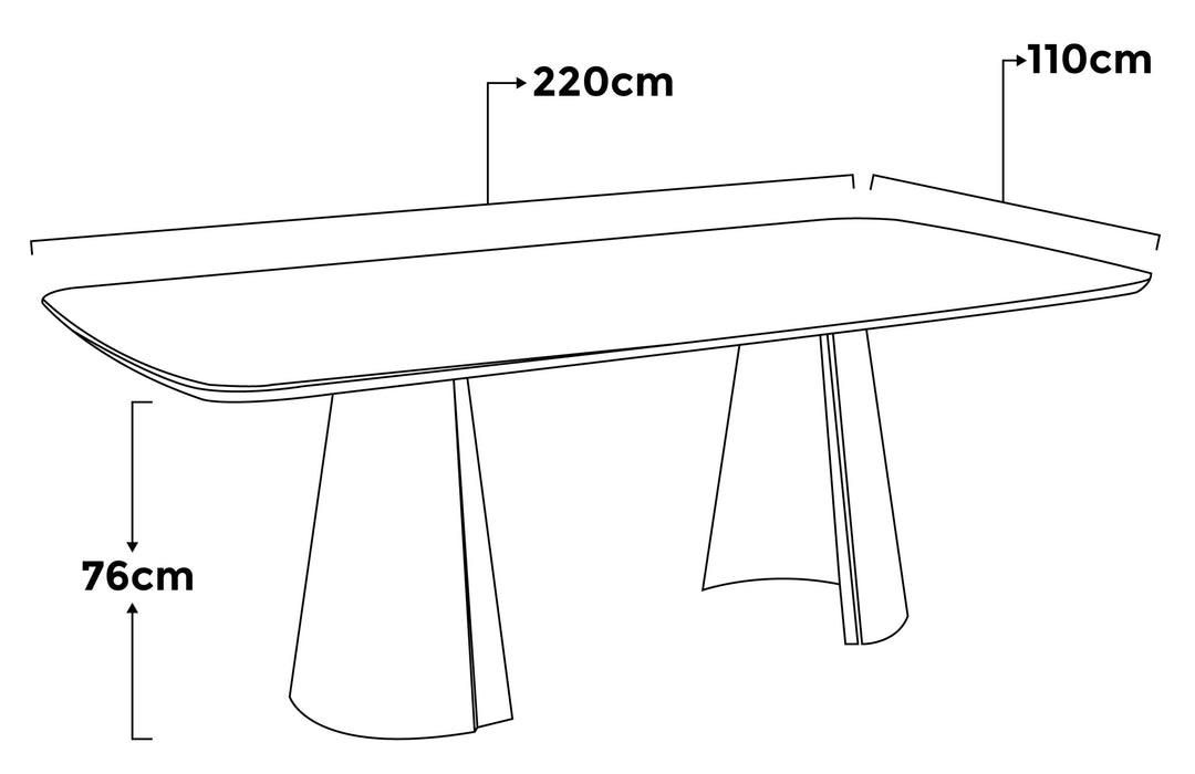 The sintered stone top of this dining table is resistant to scratches, heat, and stains, ensuring it remains beautiful for years with minimal maintenance.