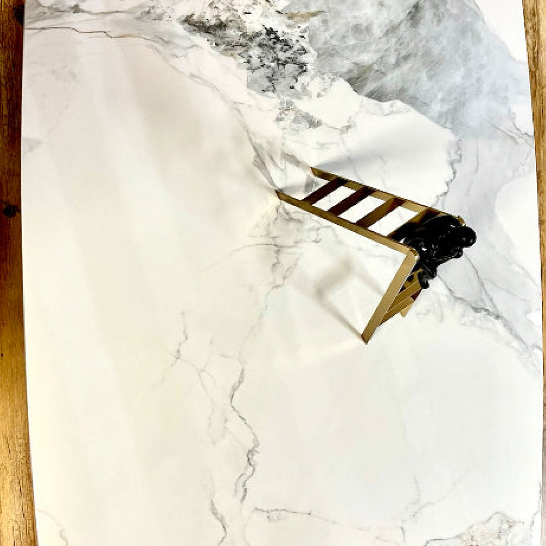 The Harvey Sintered Stone Dining Table is a sleek, durable, and low-maintenance dining table that is the perfect choice for smaller spaces. Expertly crafted with a sintered stone top, it features unique colour and patterns for a distinctive look. The heat-resistant sintered stone top is supported by a metal cross base with a powder-coated finish, creating a smooth, modern aesthetic.