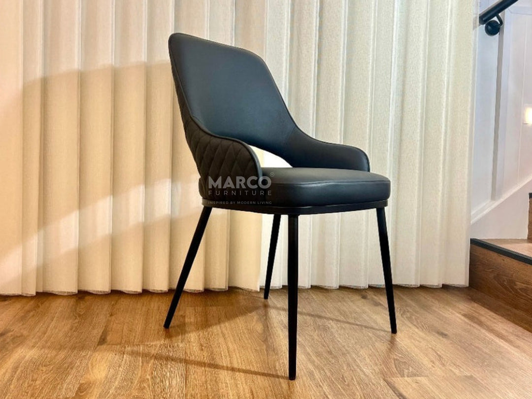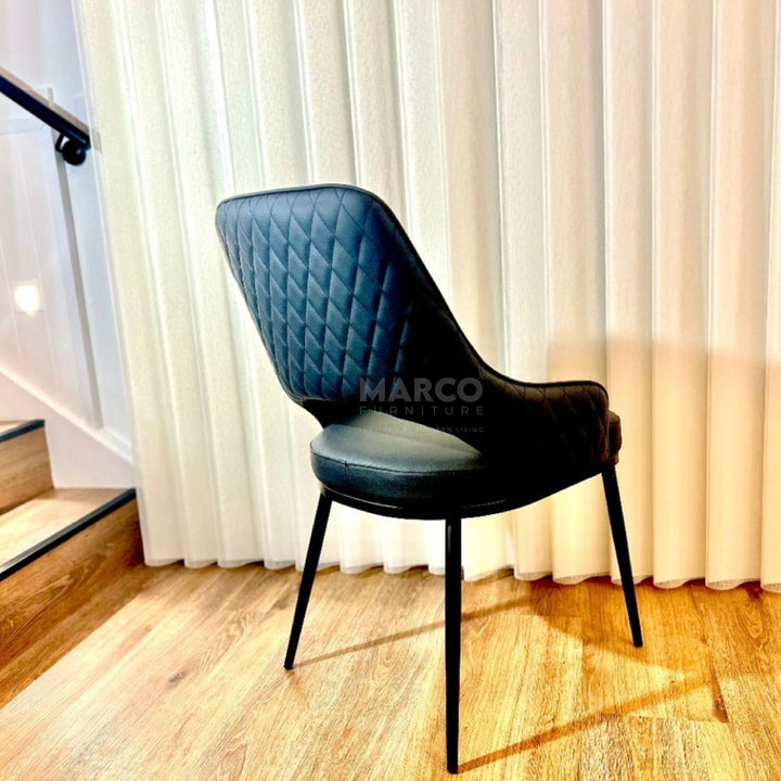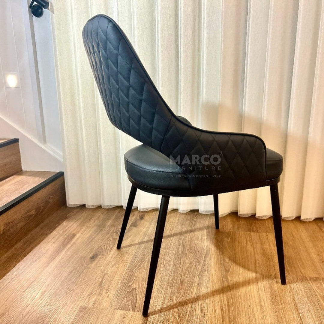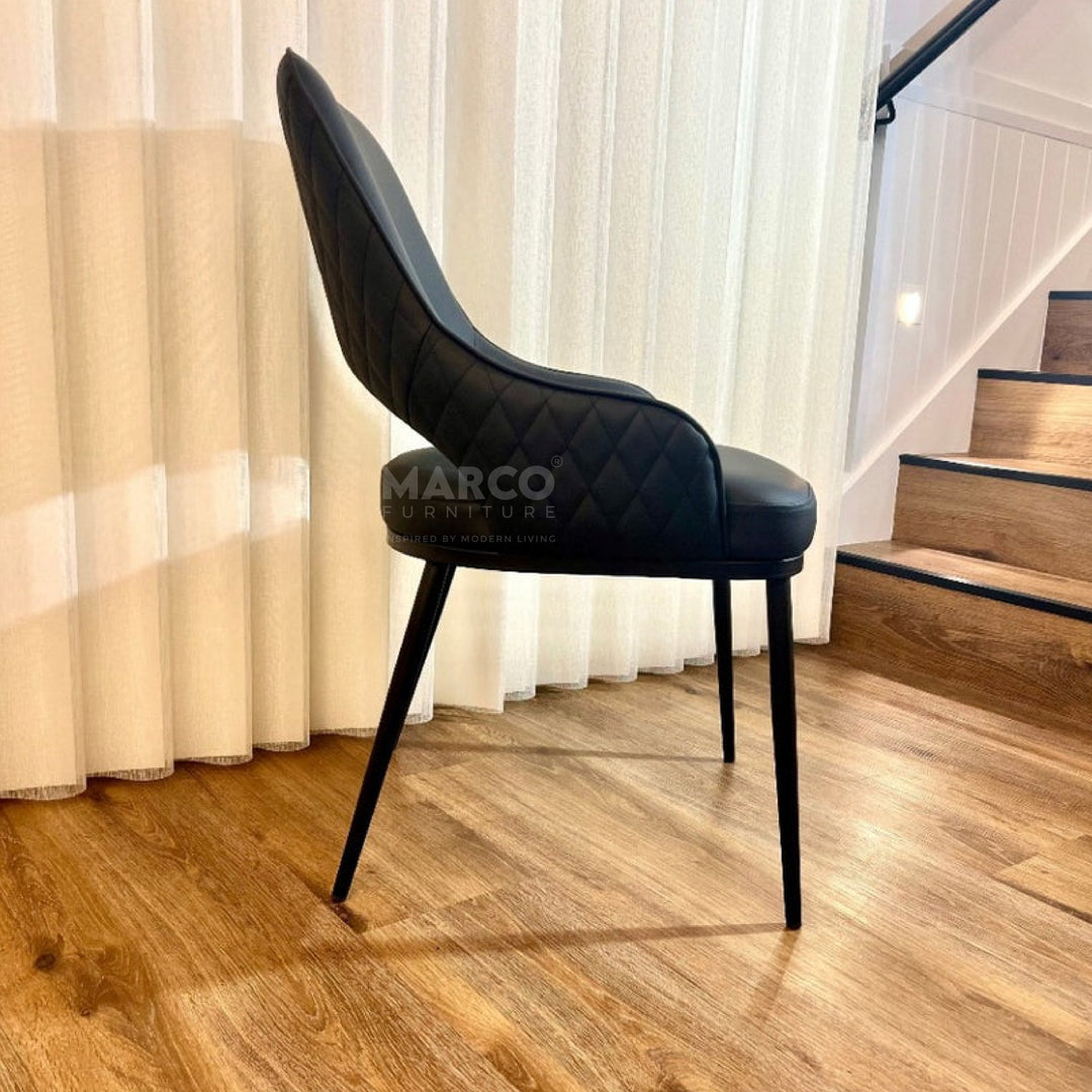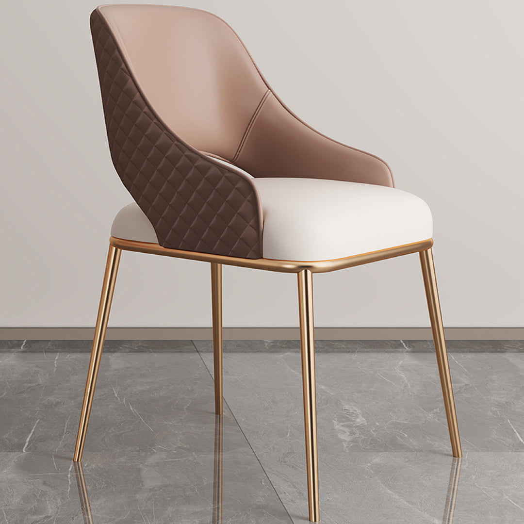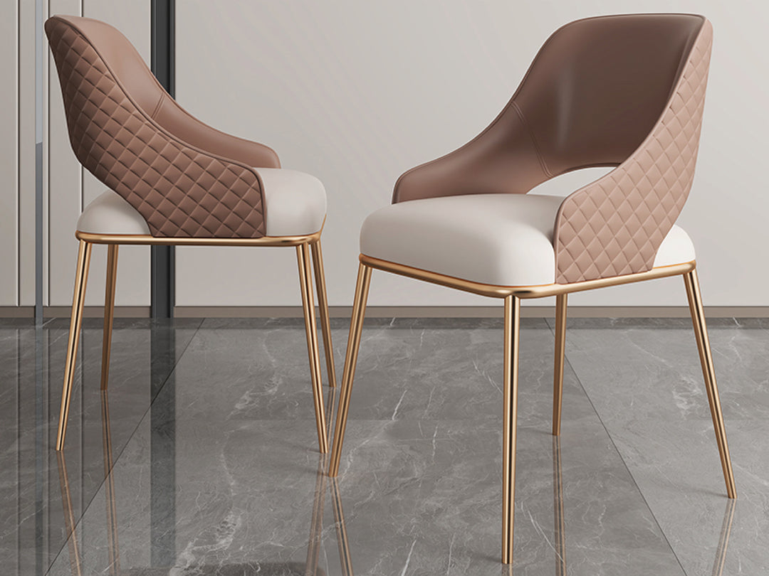 The Prada Curved Back Dining Chair, lends coastal vibes to modern dining spaces with its neutral tones and clean design. This highly durable dining chair is made from faux leather upholstery with a soft mocha tone rhombus quilted backrest contrasted with a white seat.This high-back dining chair is supported by firm, powder-coated metal legs painted gold.