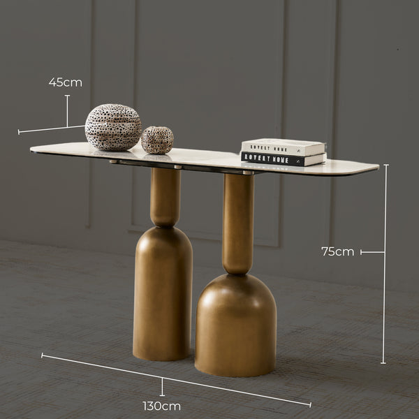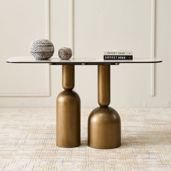 The Casa Bella Console Table is a stunning piece that captures modern design and royal grandeur. Featuring a 6mm anti-absorbent Chanel sintered stone top, this narrow console table offers a luxurious space to showcase vases, decor, and more. The base consists of two metal pedestals with a unique champagne flute design, turned upside down for added visual interest.