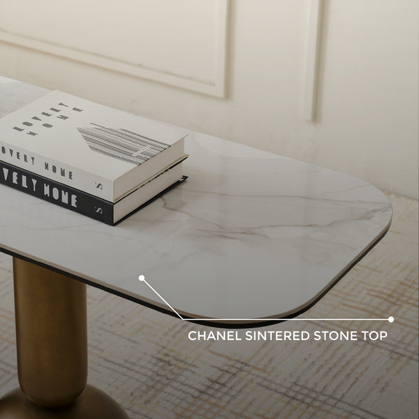 The Chanel sintered stone top is paired with a glass layer beneath, creating a luxurious and contemporary aesthetic.
