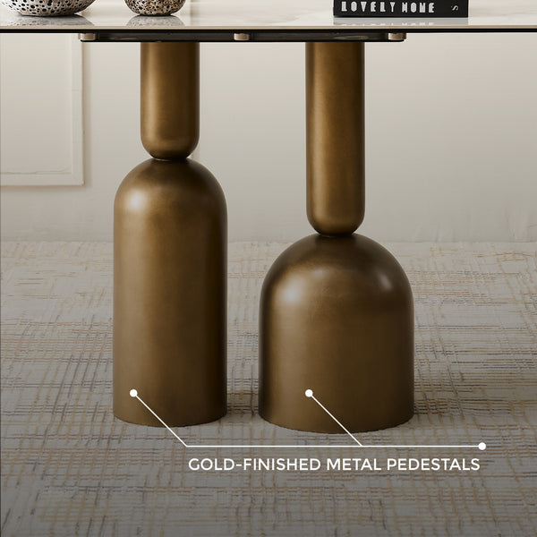 The base features two gold-finished metal pedestals, styled like inverted champagne flutes, creating a sculptural foundation.