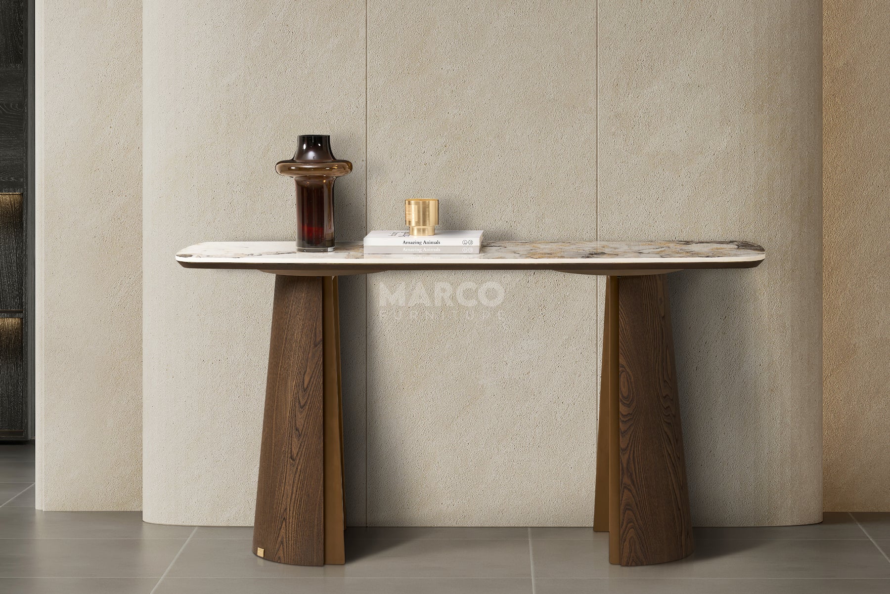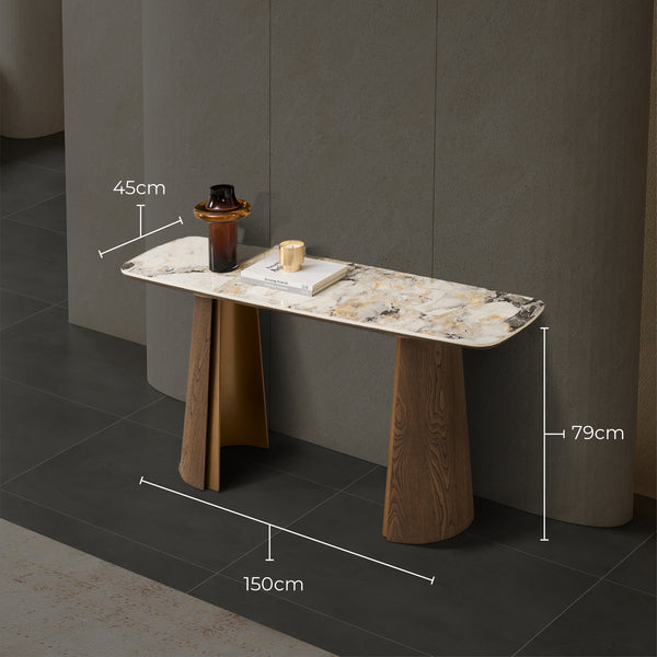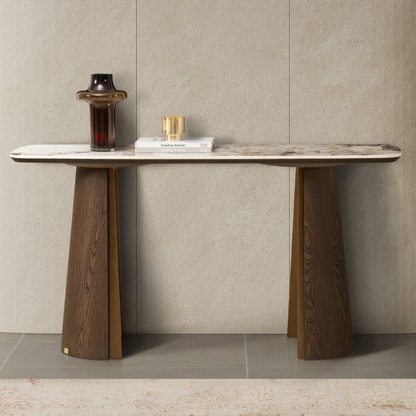 The Olmo Fiorito Hallway Table features a sintered stone top in Pandora brown. Its narrow top is complemented by tapered natural elm veneer and MDF base in toffee brown. This warm colour combination makes this narrow console table absolutely luxurious.