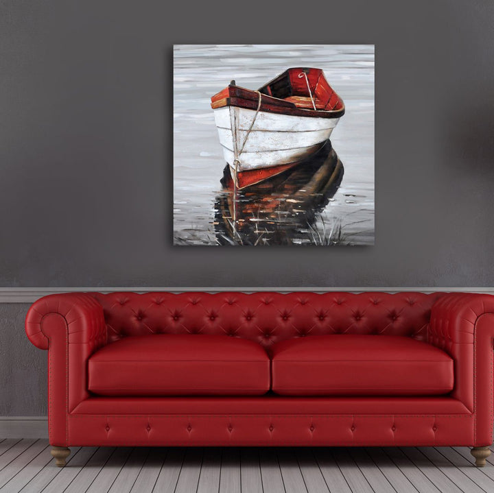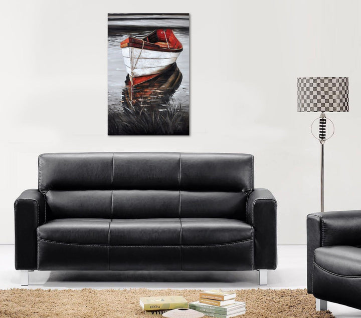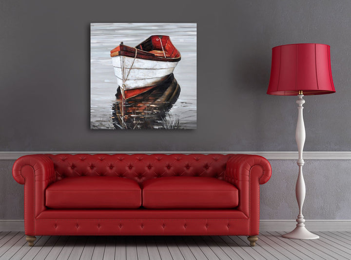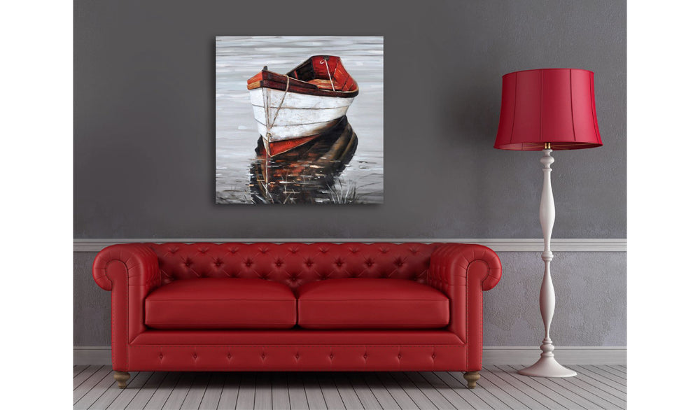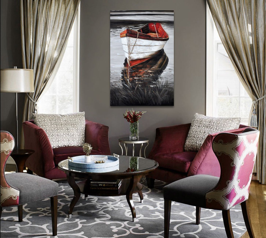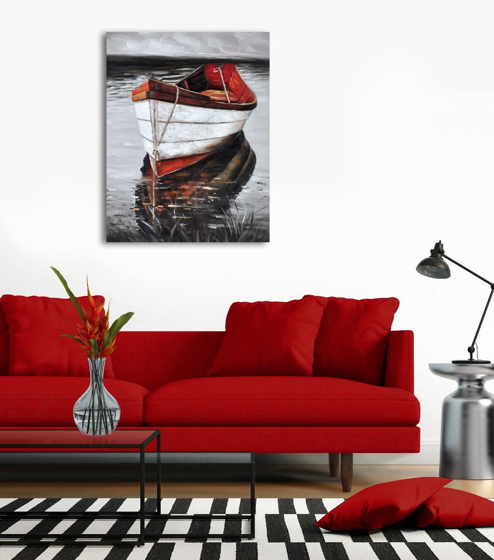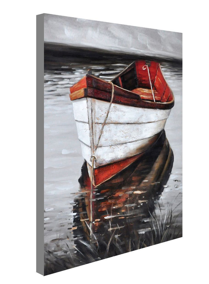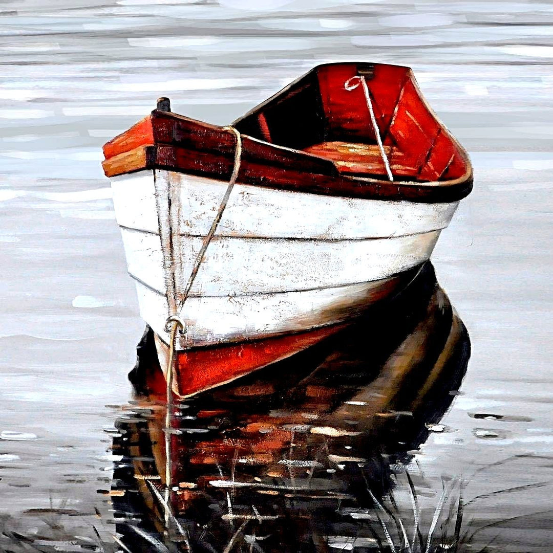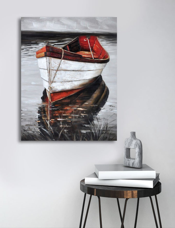 An impressive landscape art painting of a lonely Boat. With interesting background layer of black and white, and play of shadows and symmetrical lines conveyed into a beautiful boat, this an undeniably stunning fine art piece.