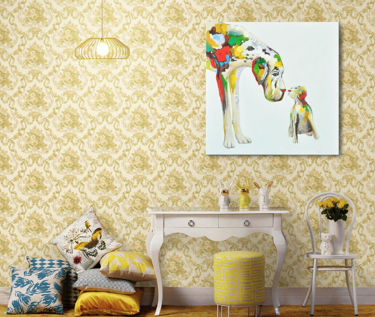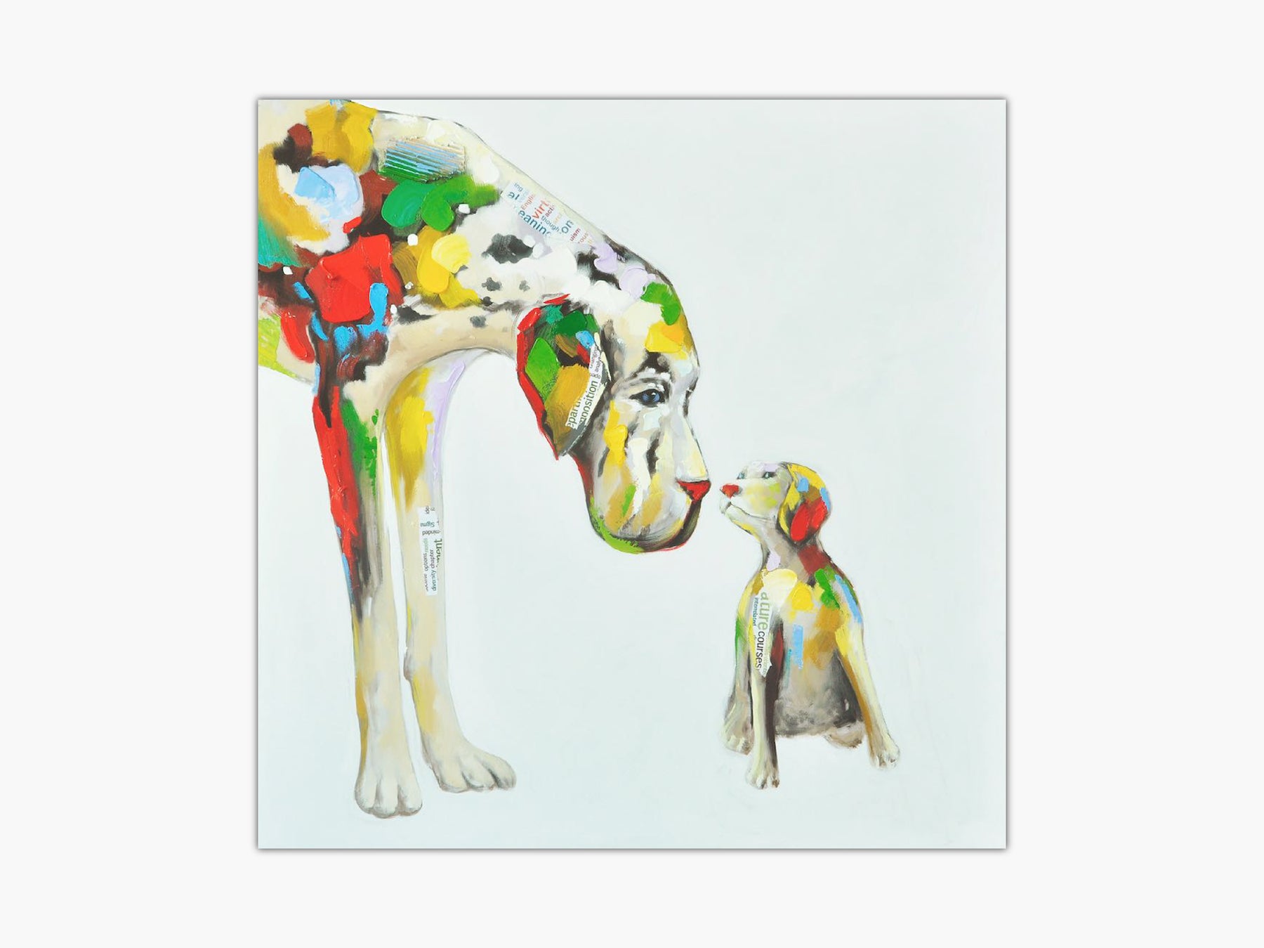 Gentle beauty of two adorable puppies showing love to each other. With simplicity and color play, Adorable Contacts displays the unconditional love between parents and children. Based on white, the sweet moment and dogs are contrasted with blend of vivid colors. Treat your and the eyes of your guests with animal inspired fine art painting.