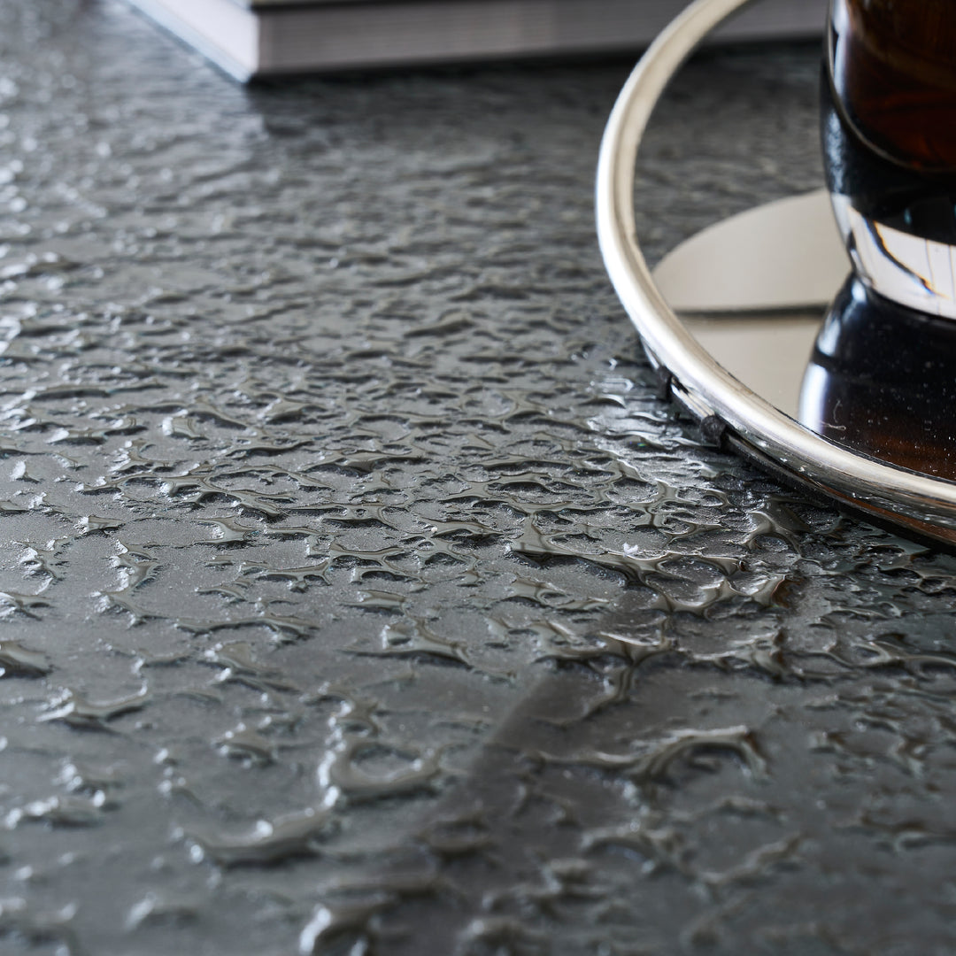 The Copenhagen Collection features a contemporary end table. With its grey ripple glass top, this side table harmonizes with industrial and modern living rooms. The base contrasts with the grey glass top, made from metal and finished in gold, creating a regal combination.