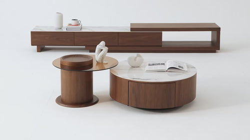 The Bahamas 2-Piece Extendable Entertainment Unit easily adapts to any living room setup with its adjustable length. Its walnut veneer section includes a slide-in feature for extra versatility. Topped with white sintered stone, it creates a striking contrast and a stylish surface for modern living room displays. The unit also comes with three wooden drawers, offering generous storage for your essentials.