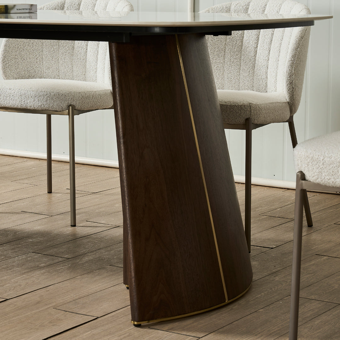The Bellino Sintered Stone Dining Table boasts a stunning sintered stone top that's as stylish as it is durable. The MDF legs, finished with a walnut veneer ripple grain, provide it a natural appeal. Its modern design makes it the perfect addition to any contemporary dining room.