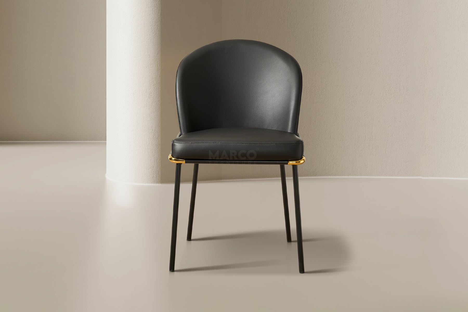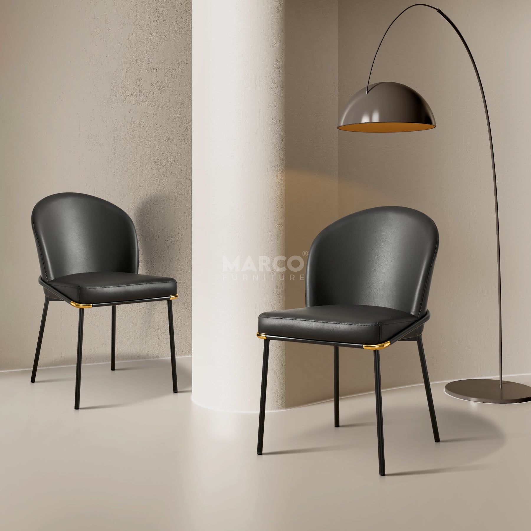 The Cooper Black Faux Leather Modern Dining Chair offers a stylish armless design with a comfortable backrest. This modern dining chair is upholstered in high-quality black leather and foam filled, providing comfort and longevity. Its metal legs come in a matte black finish, accented with champagne gold joints that gives it a luxurious appeal.
