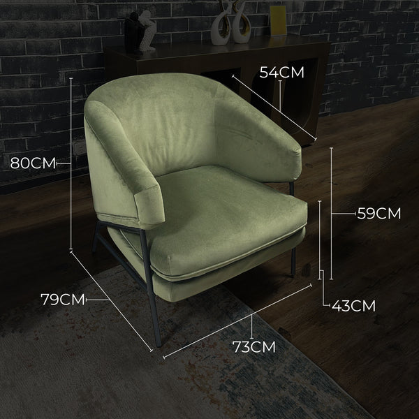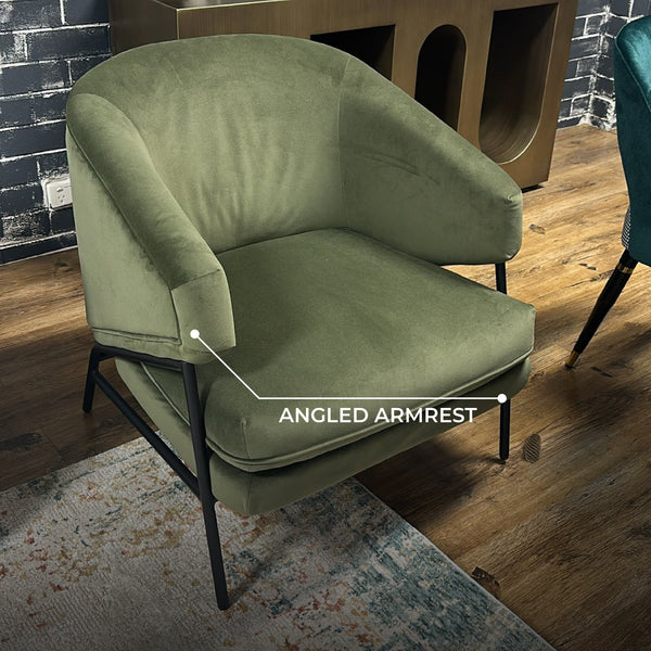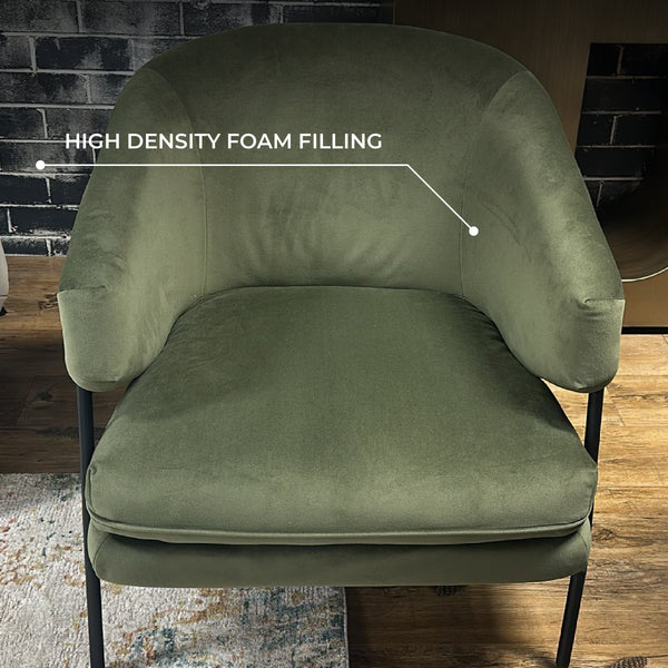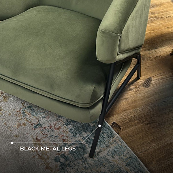 Ollie Velvet Occasional Chair combines contemporary design with inviting comfort. Wrapped in rich moss green velvet, its high-density foam seat offers plush support, while the curved back and angled armrests cradle you in ease. Supported by black metal legs, this accent armchair brings warmth and comfort to your modern living space. With its refined design, this velvet armchair adds a stylish hint to living rooms, reading areas or any cozy corner in your home.