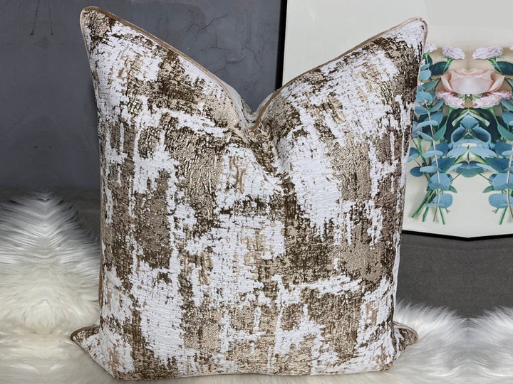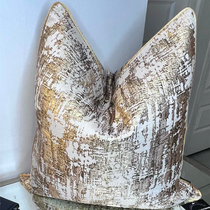 This Snowflake Gold & White Feather-Filled Pillow features a striking pattern of gold and white, with a textured finish that adds a luxurious feel to your space. Crafted from premium jacquard fabric, it is filled with 1600g of washed natural white duck feathers, ensuring comfort and long-lasting durability. The clean piped edges enhance its sophisticated look, making it perfect as an accent piece for modern or classic interiors.