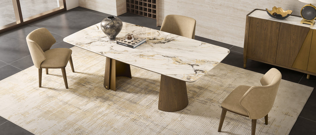 Create a Scandinavian-inspired living space with Marco Furniture’s Olmo Fiorito Collection. Featuring a stunning Pandora sintered stone top, each piece is finished with an elm veneer base in a rich toffee brown colour, exuding both warmth and grace. Whether it's the narrow hallway table, the impressive dining table, or the versatile entertainment unit, this collection creates an inviting atmosphere in both living and dining spaces.
