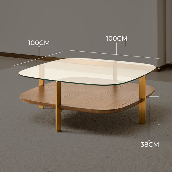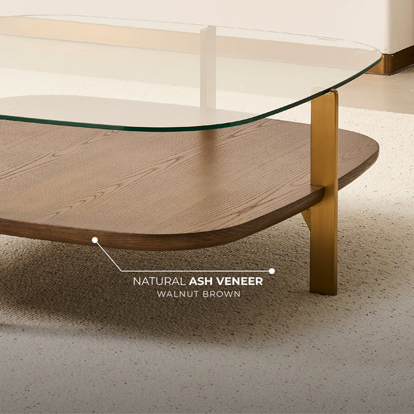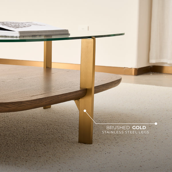 The Roma Glass Top Coffee Table showcases a mid-century design with a modern twist. Its tempered glass top provides an ideal display space for vases and sculptures, while the lower natural ash veneer section adds rustic charm to it. Sturdy brushed gold stainless steel legs complete the look, bringing refined visuals to this modern coffee table.