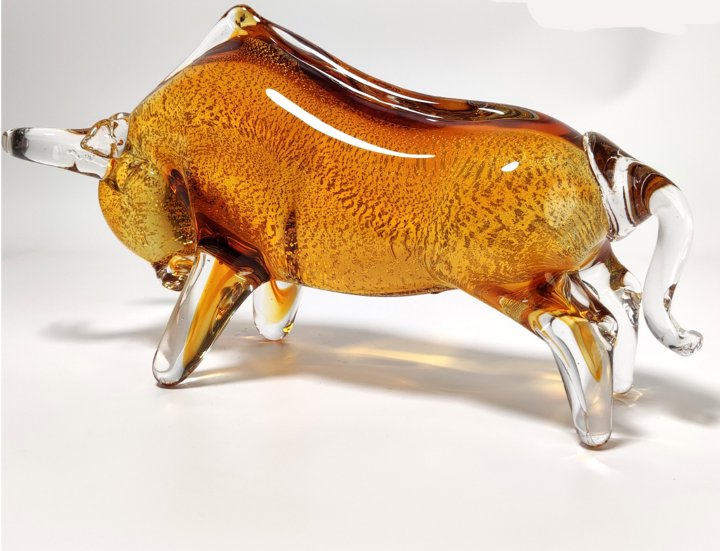 The Bull Murano Style Glass Sculpture is a handmade piece of art. Made from hand blown glass, this accent piece is molded into a bull shape with a gold-toned body. This bull sculpture makes an excellent centerpiece to an end table, console table, dining table, mantelpiece, and elsewhere for endless display options.