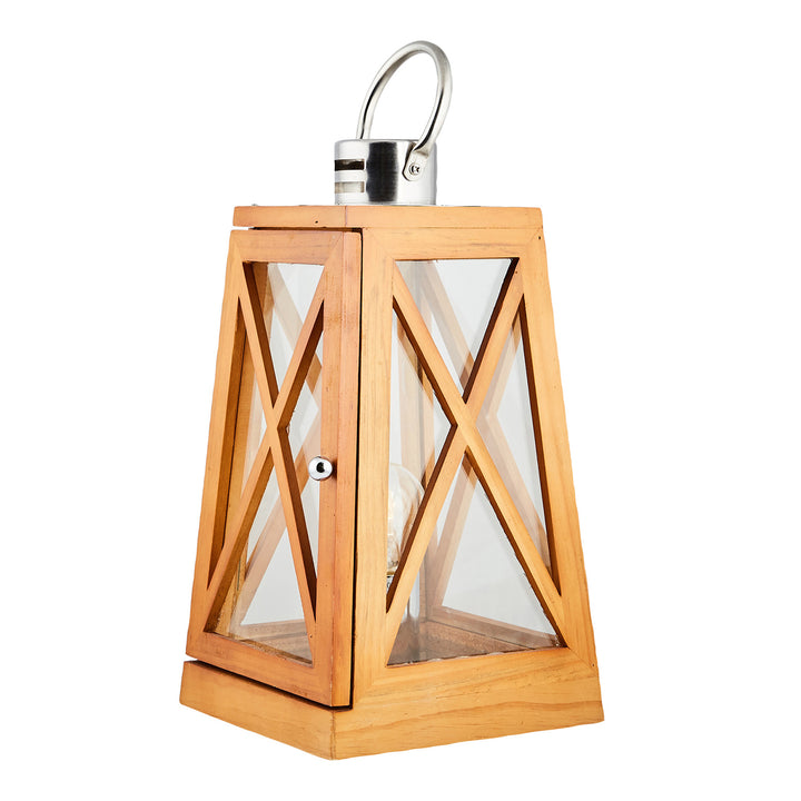 The Travis Natural Lantern Wooden Lamp features a traditional lantern shape, perfect for adding an antique glow to the space. Its boxy wooden frame comes with glass panels and crisscross wooden details, used to create a vintage look. The shiny metal hoop holder at the top provides a striking contrast to the natural wooden frame, complementing its overall design.