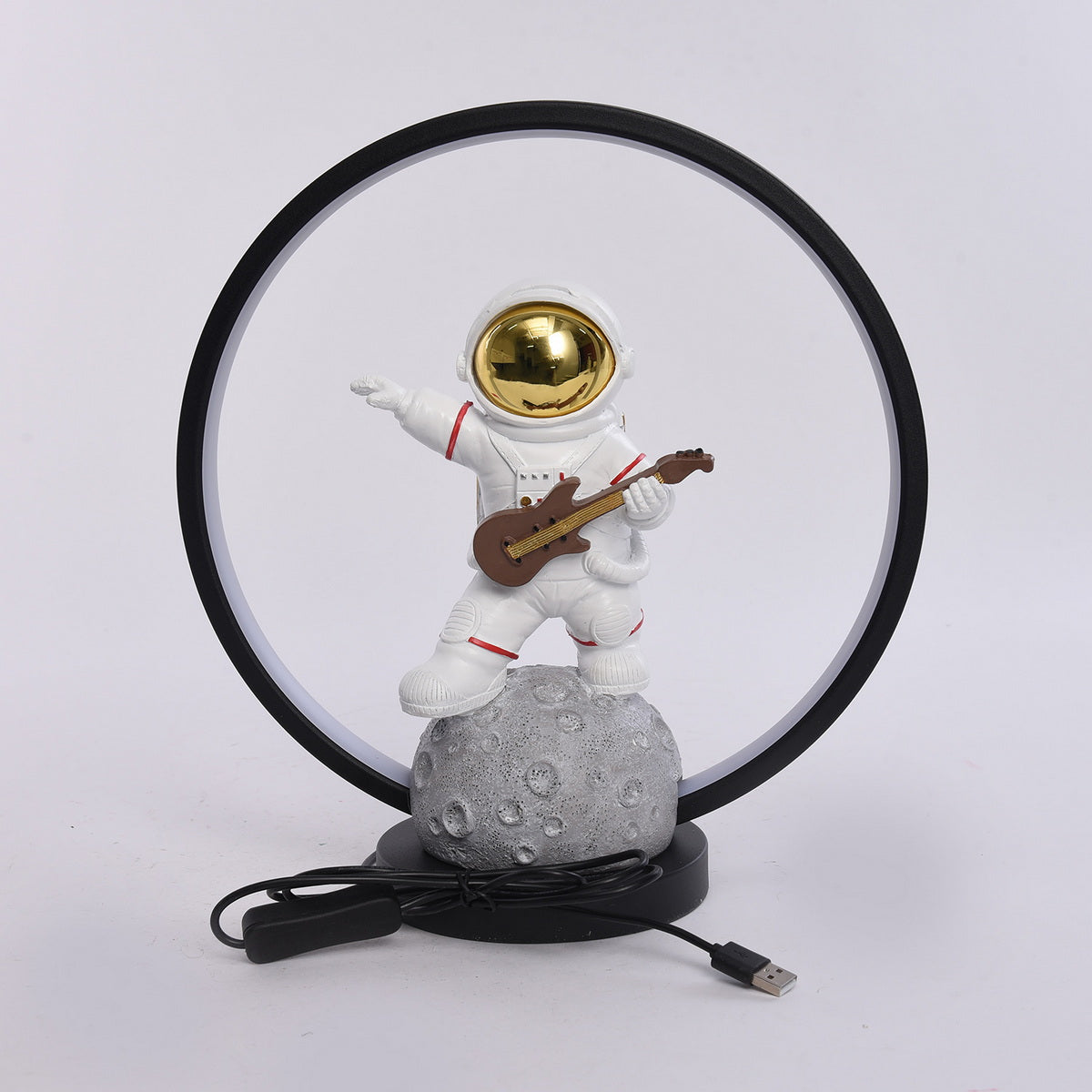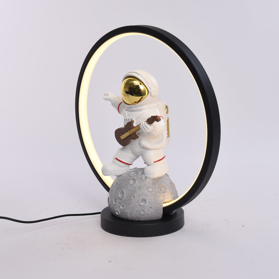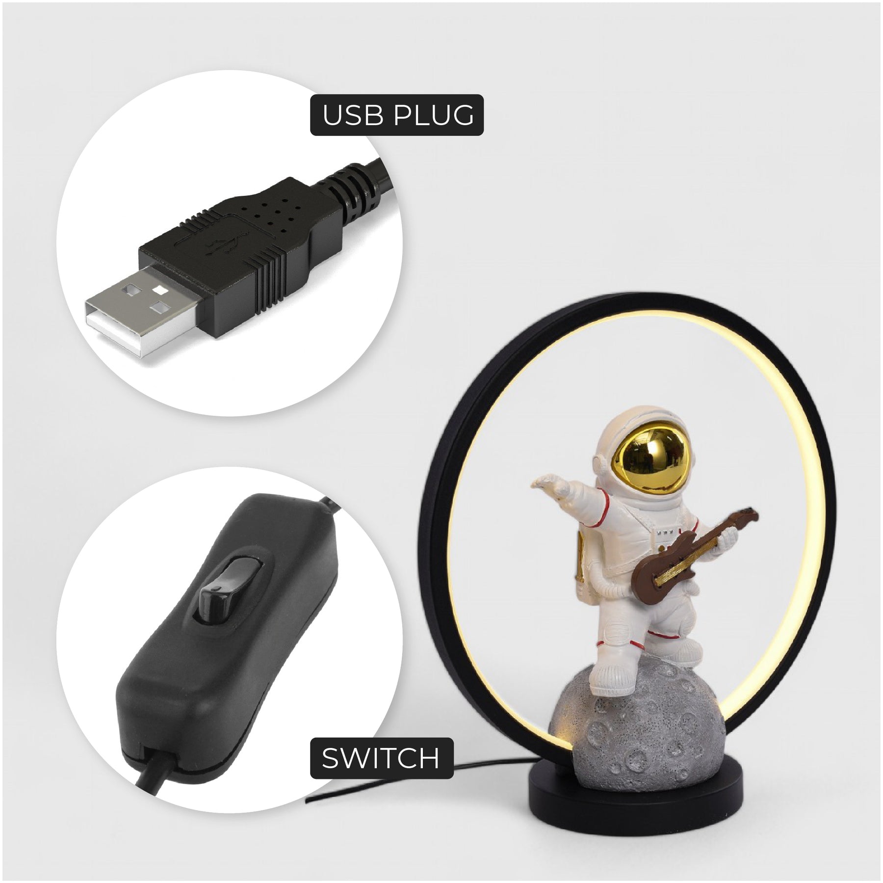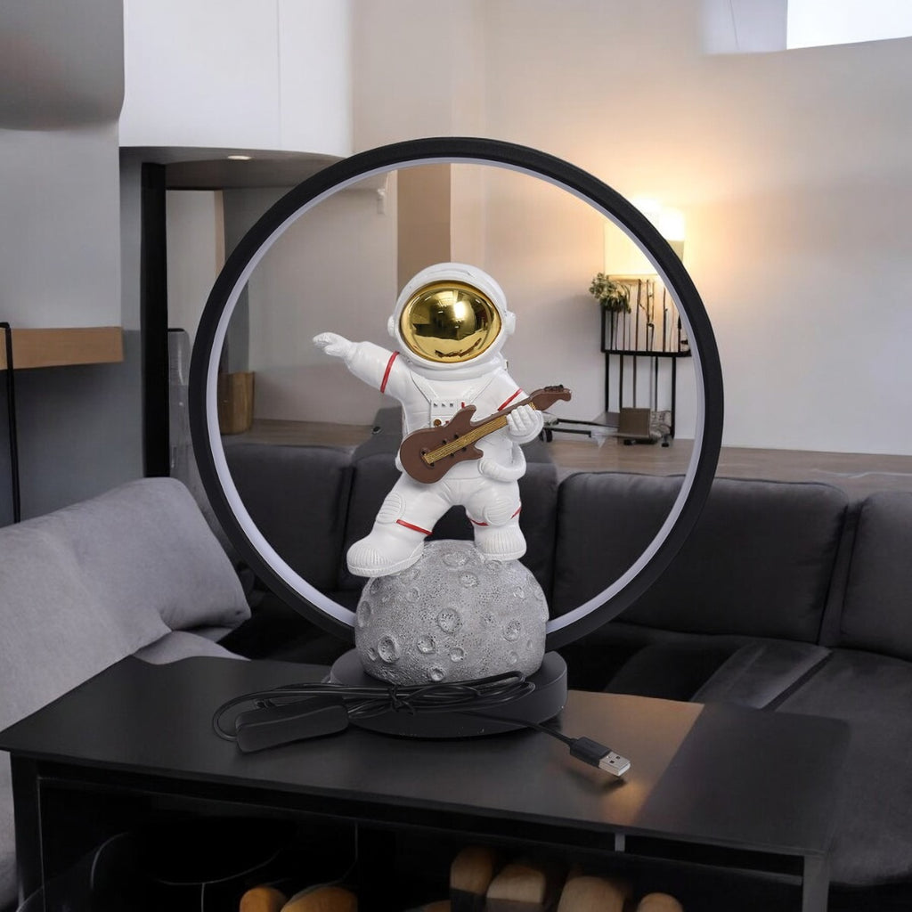 The Astronaut LED Ring Lamp creates an ambient glow, perfect for any display area. This unique lamp features a white resin astronaut holding a guitar, enclosed within a black metal ring illuminated with a glowing LED strip. The lamp’s circular black base offers stability, while its USB operation makes it convenient to place in any room. Whether it’s for a console table, hallways, kids’ room, or office, this lamp is ideal for your home decor.