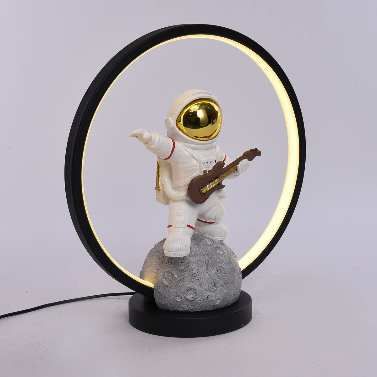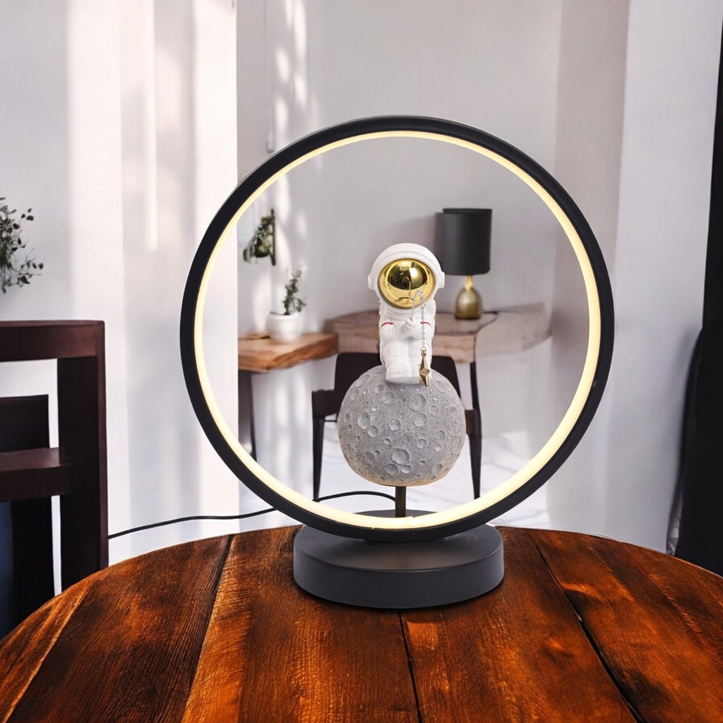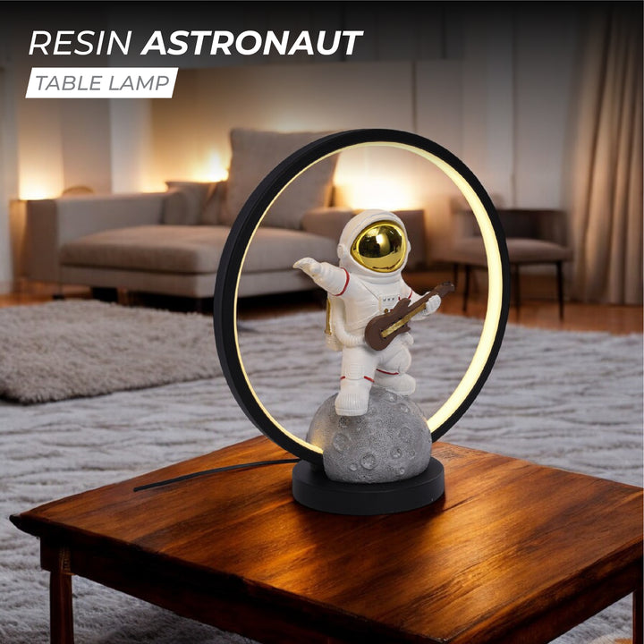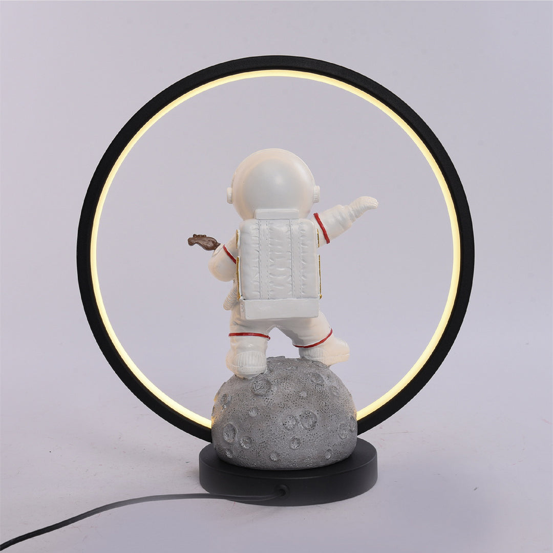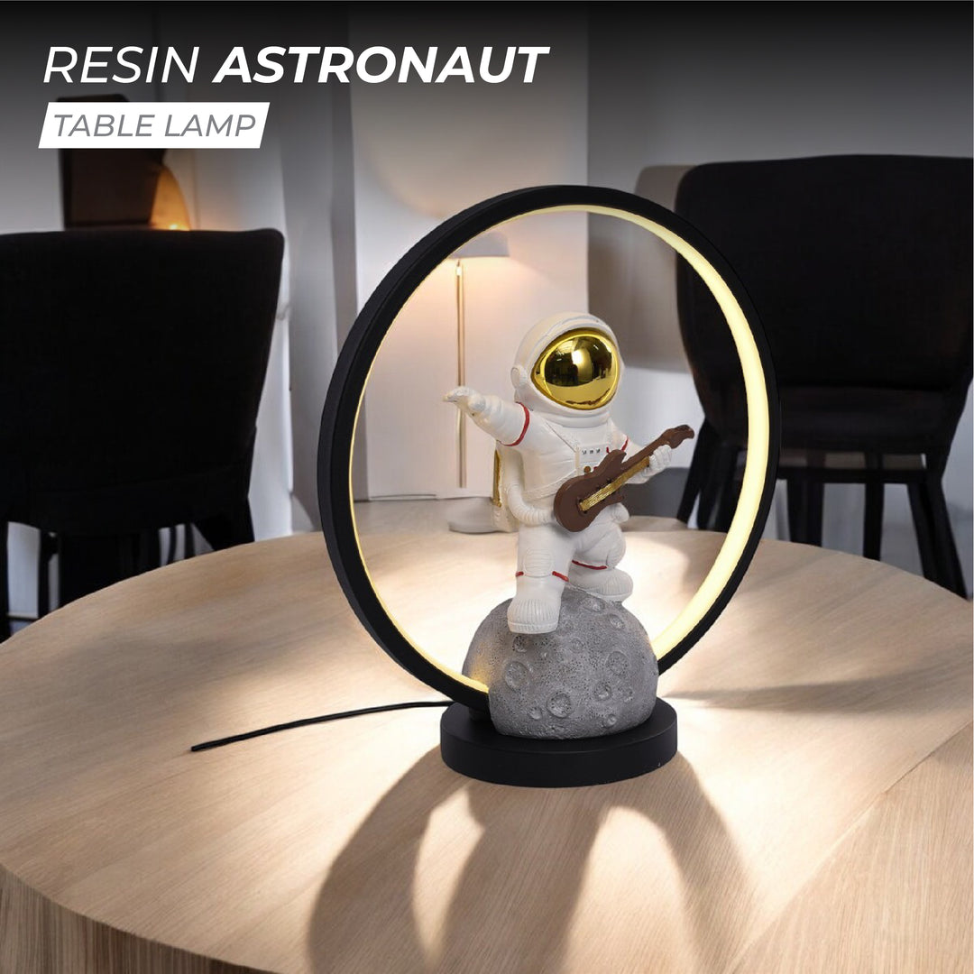 The Astronaut LED Ring Lamp creates an ambient glow, perfect for any display area. This unique lamp features a white resin astronaut holding a guitar, enclosed within a black metal ring illuminated with a glowing LED strip. The lamp’s circular black base offers stability, while its USB operation makes it convenient to place in any room. Whether it’s for a console table, hallways, kids’ room, or office, this lamp is ideal for your home decor.