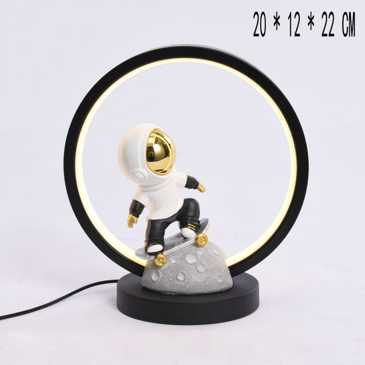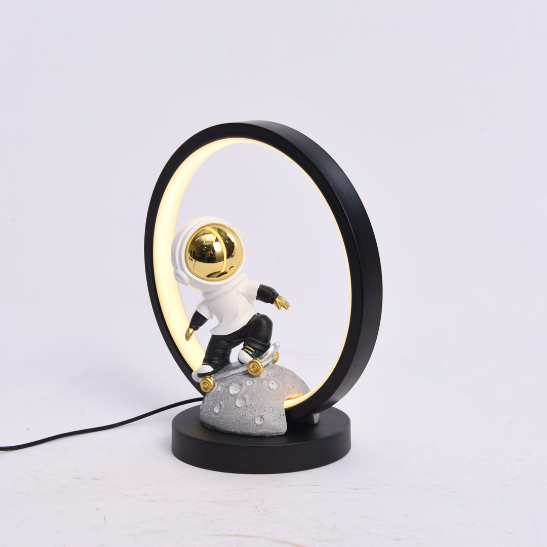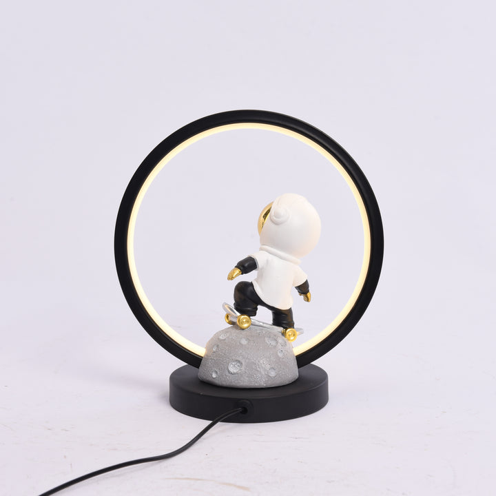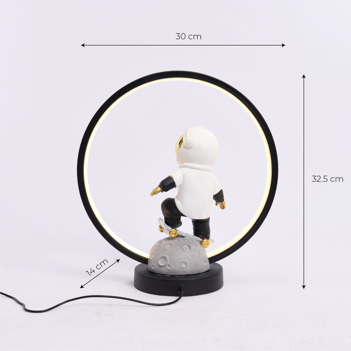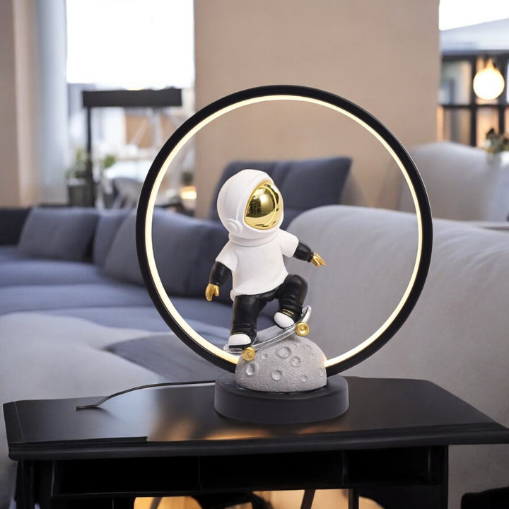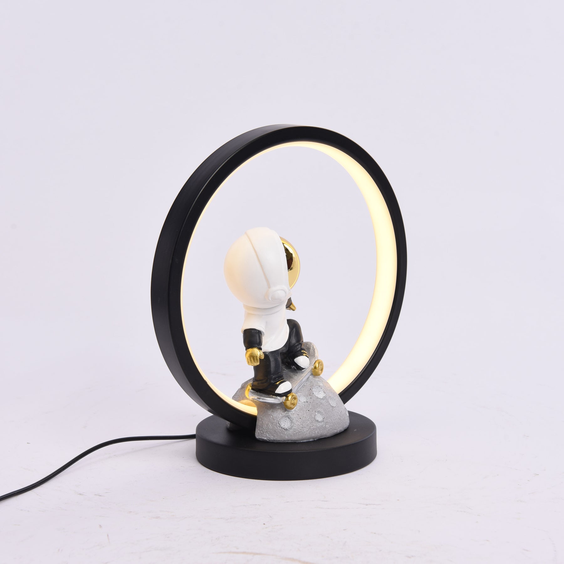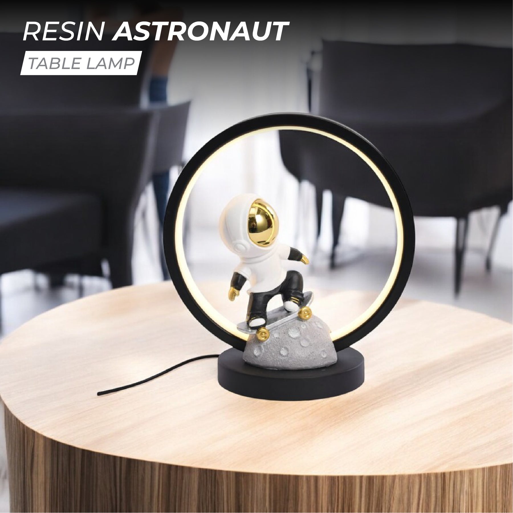 The Resin Astronaut Table Lamp showcases a black and white resin astronaut with gold accents, standing on a grey textured moon. A black metal ring, lined with a glowing LED strip surrounds this astronaut, creating a contrasting glow. This desk lamp features a USB charging port, allowing flexible placement on side tables, console tables, or study desks.