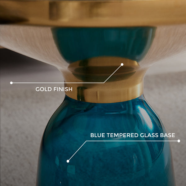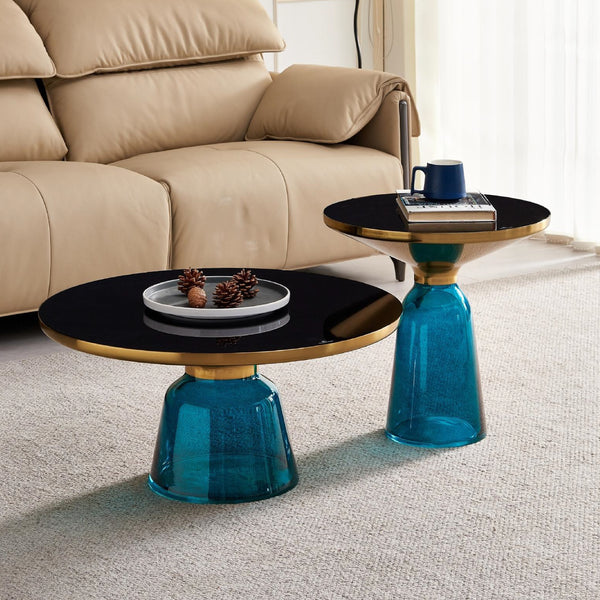 Bell Round Glass Coffee Table (BLUE) with Hand-Blown Glass Base (Set of 2)