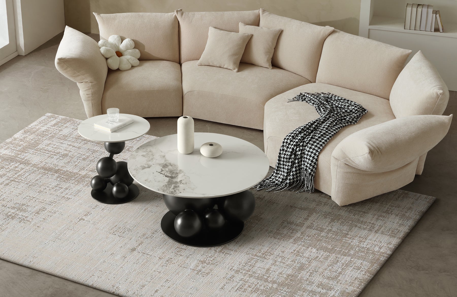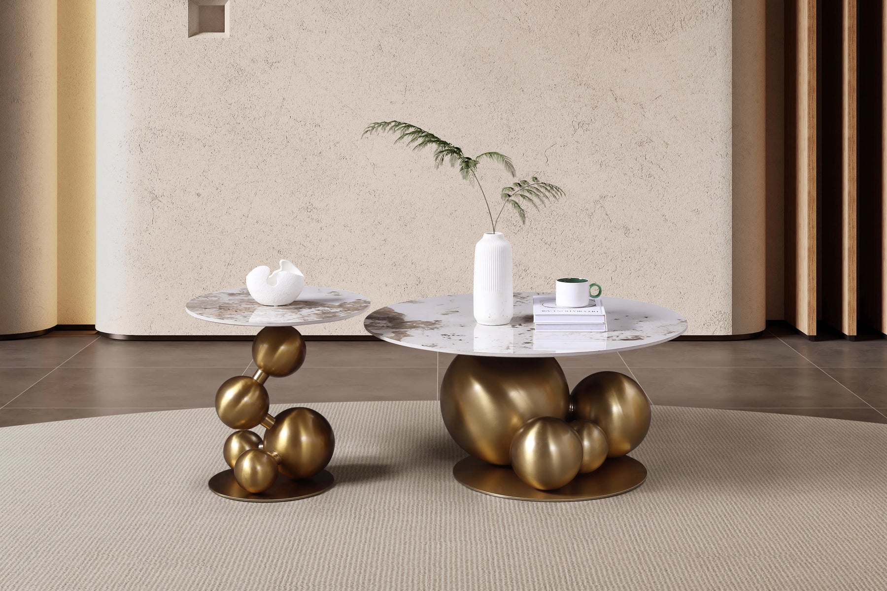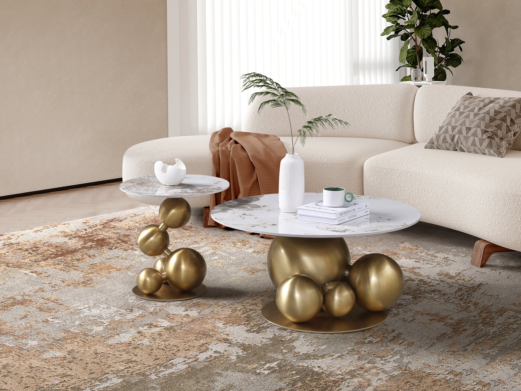 The Bruno Coffee Table Set features a striking sculptural base of organic golden spheres crafted from premium stainless steel with a lustrous gold finish. The elegant marble-look sintered stone top provides a sophisticated surface for decor and daily essentials, making this contemporary piece a captivating focal point that transforms any living space.