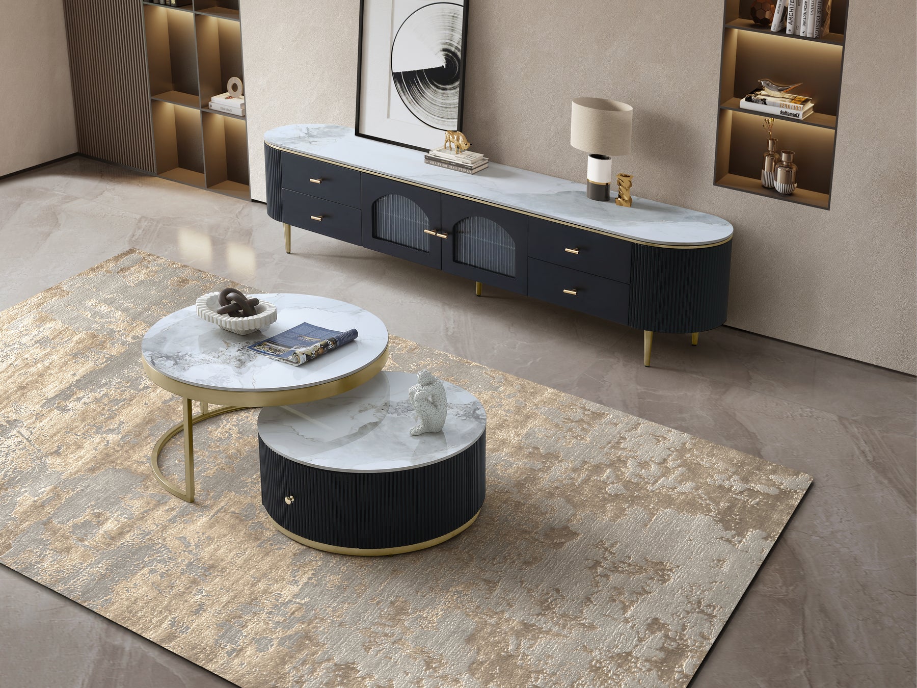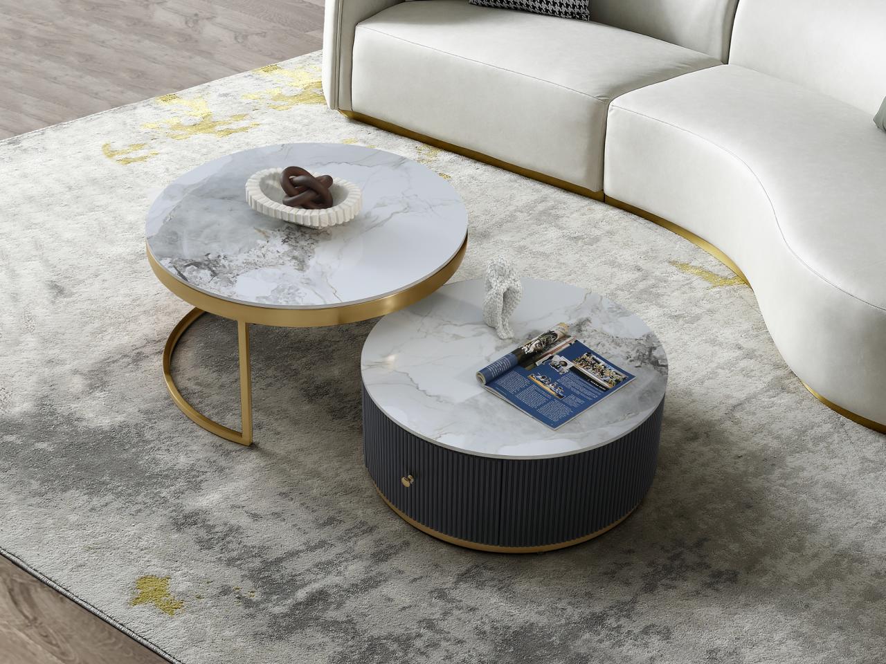 The Doyle Nesting Coffee Table Set brings a modern balance of texture and shape to your living space. The smooth white sintered stone tops rest on gold stainless steel frames that add a warm, refined touch without being flashy.