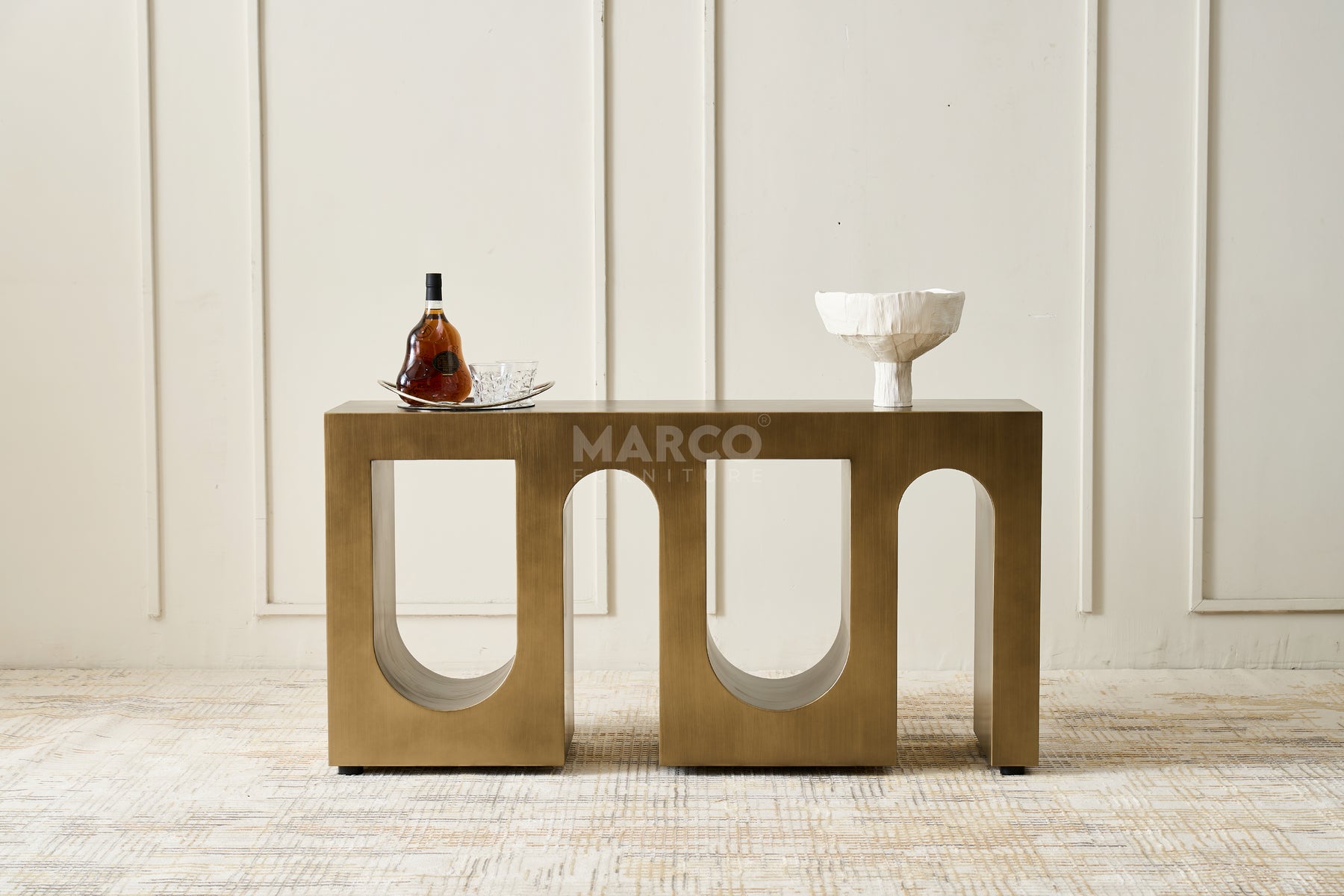 The Dublin Metal Console Table is designed with royal artistry, shape, and color. It is made from highly durable metal with a powder-coated gold finish. This hallway table is distinguished by its hollow arch base, featuring a unique design and a glossy gold finish. Place it in your entryway to glorify your interior.