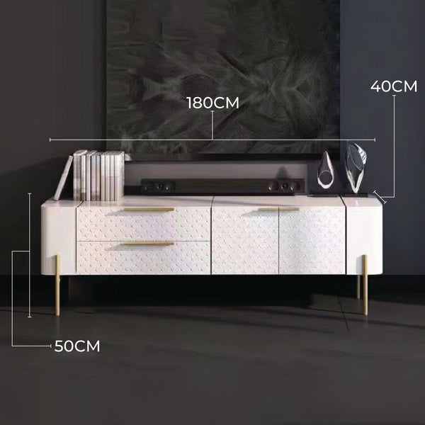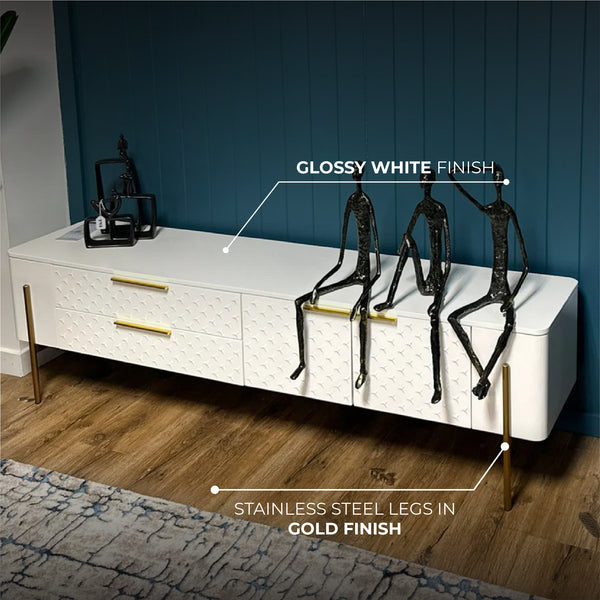 The Bravia TV Console features subtle textured patterns on the glossy white finish surface and gold accents for a graceful look. This TV cabinet stands on gold stainless steel legs in a unique fluted design. Its 2 wooden drawers and 2 cabinets offer ample storage for media devices, helping keep your living room clutter-free.