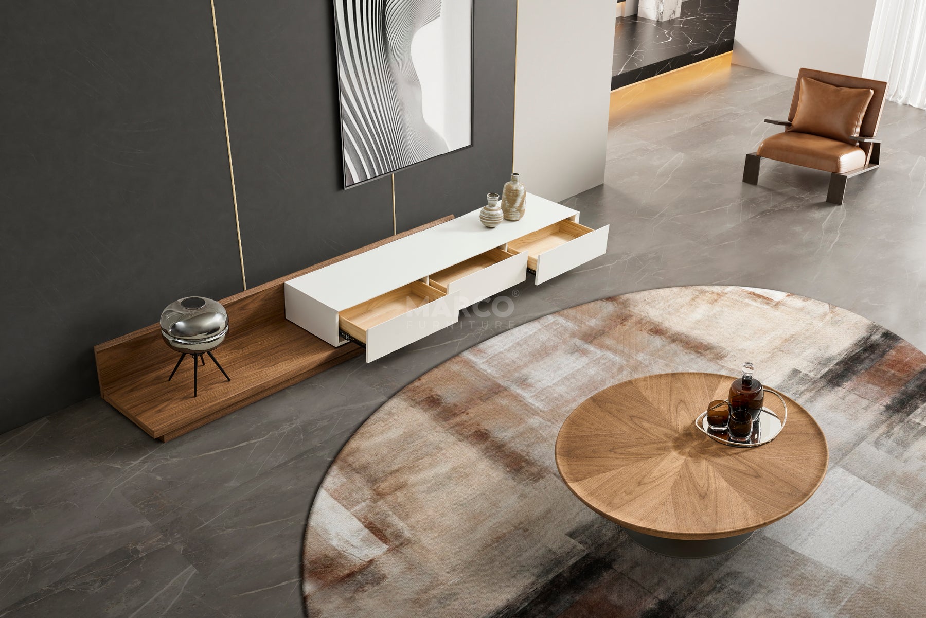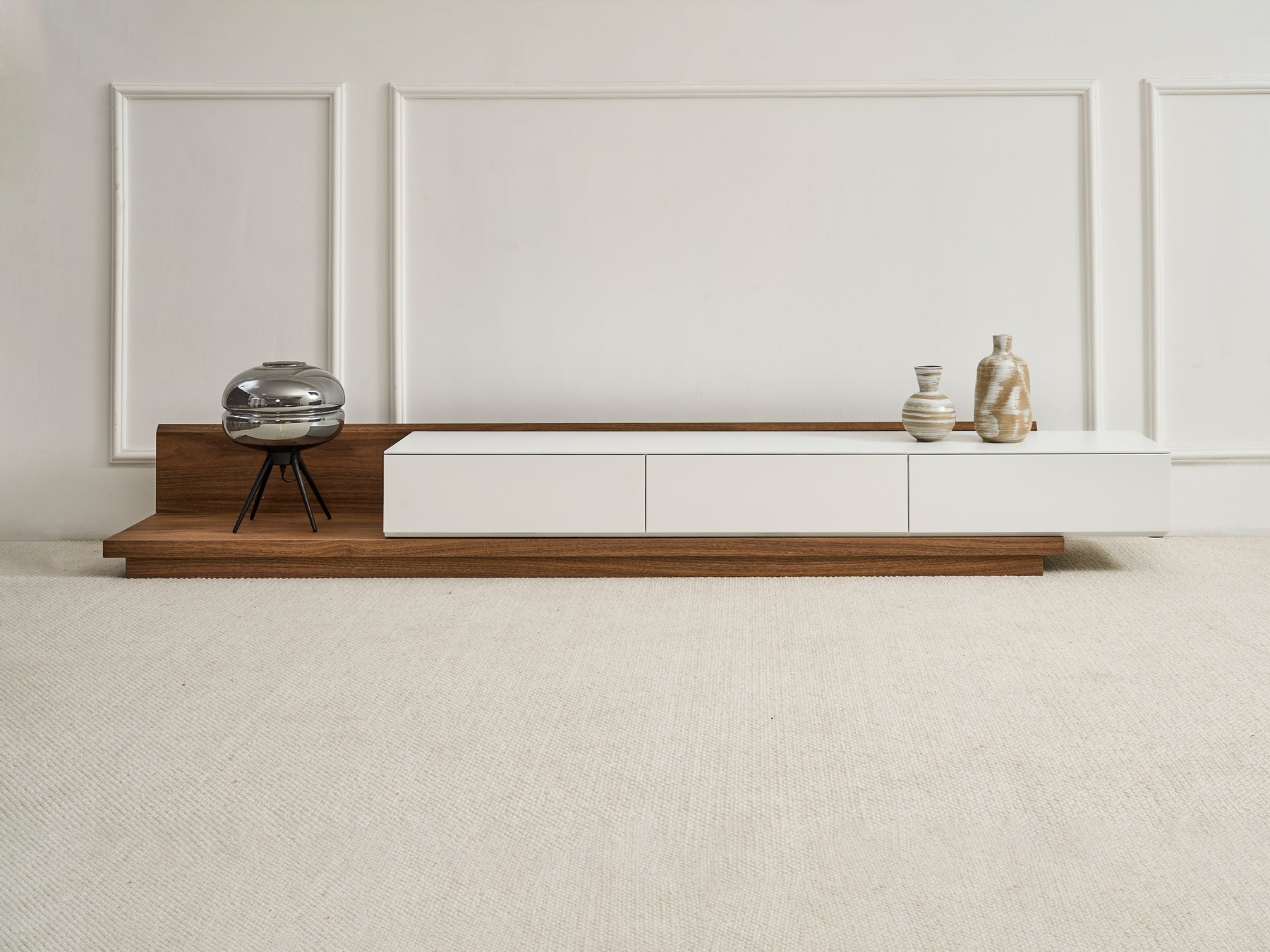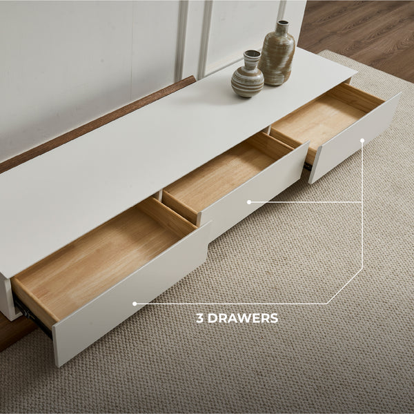 The Casper TV Stand is a contemporary media console with an extendable design, allowing you to adjust its length to suit different living room layouts and larger TVs. It features three solid wood drawers for sufficient storage, perfect for organising media accessories. Its natural walnut veneer and matte white finish give it a stylish appeal, making it a perfect addition to any contemporary space.