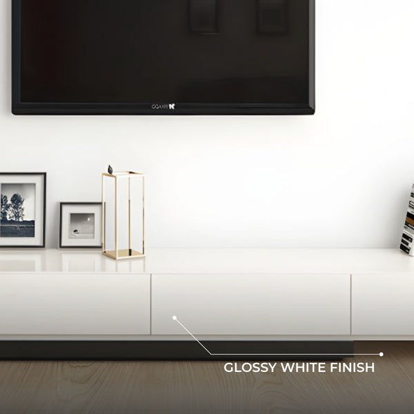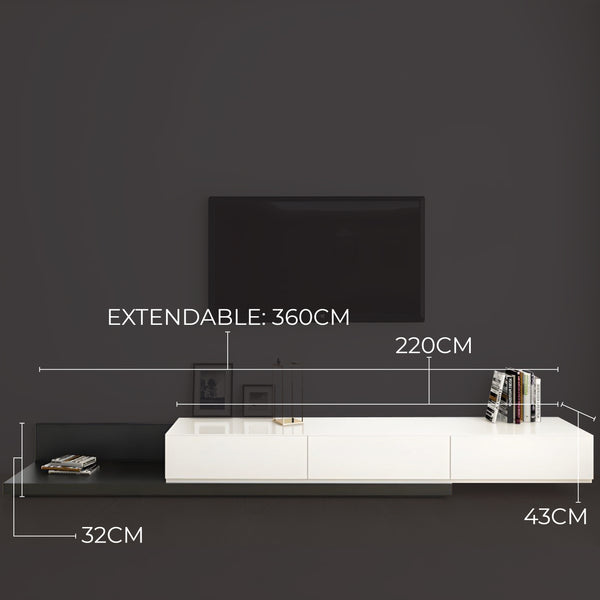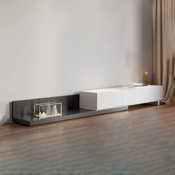 The Casper Extendable Modern TV Stand is a perfect centerpiece for your living room. This modern-inspired piece features an extendable design, allowing it to accommodate extra-large TV screens with ease. The sliding extendable top, finished in glossy white paint, pairs perfectly with the black oak veneer base. The 3 solid wood drawers offer ample storage to keep your media essentials organized and your space tidy.