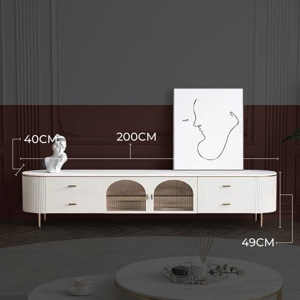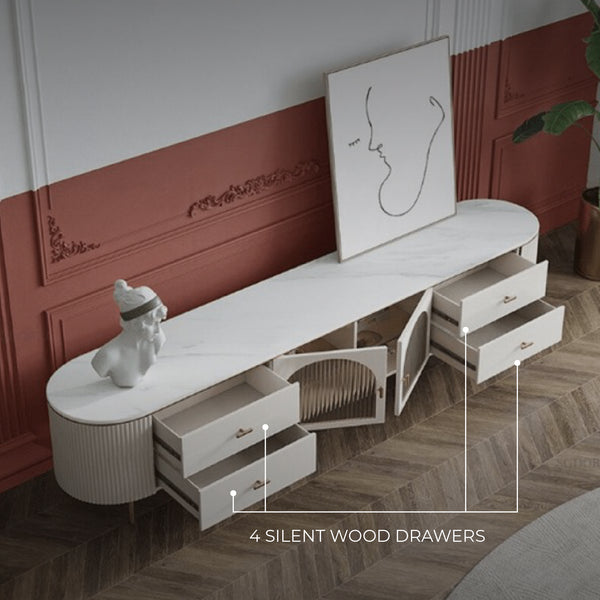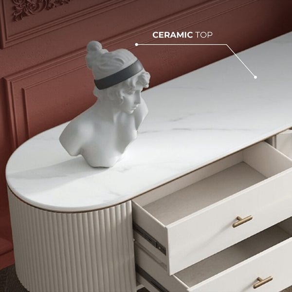 The Doyle Modern Italian TV Unit is a perfect addition to your living room. Its durable ceramic top, smooth silent wood drawers, and two spacious cabinets offer sufficient space to display or store your living room essentials. With its delicate curved design and fluted detailing, it exudes a retro aesthetic, making it perfect for coastal-inspired interiors.