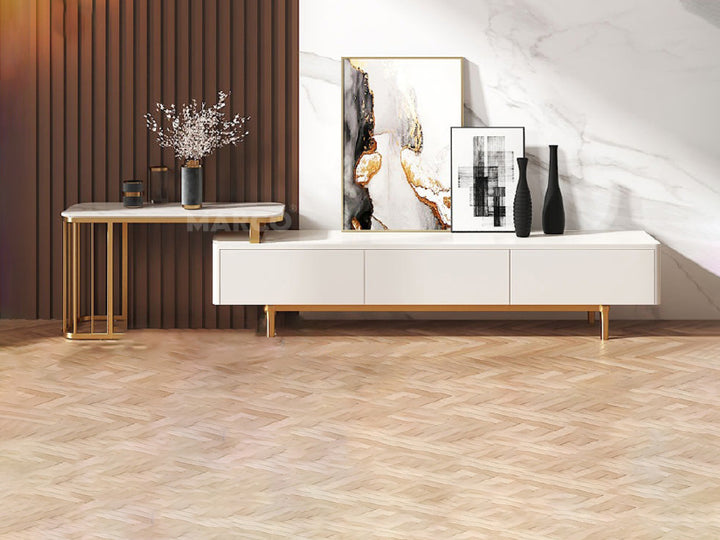 The glossy white finish and golden stainless steel legs give this TV unit a royal appeal.