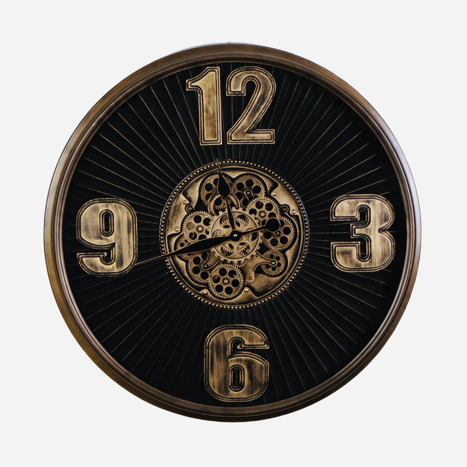 The Extra Large Vintage Moving Cogs Wall Clock is a striking blend of old-world charm and modern design. With its bold black frame and brass detailing, this timepiece features moving cogs with a vintage mechanical theme. The clock is powered by 3 AA batteries (not included with clock) - 2 batteries for gears to start spinning, 1 battery for clock hands to move to tell time.