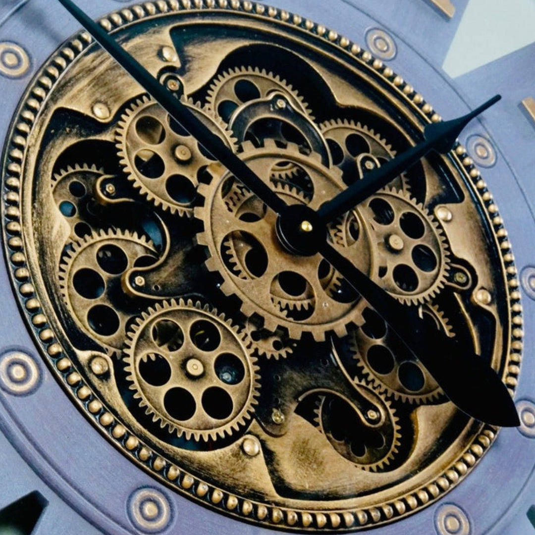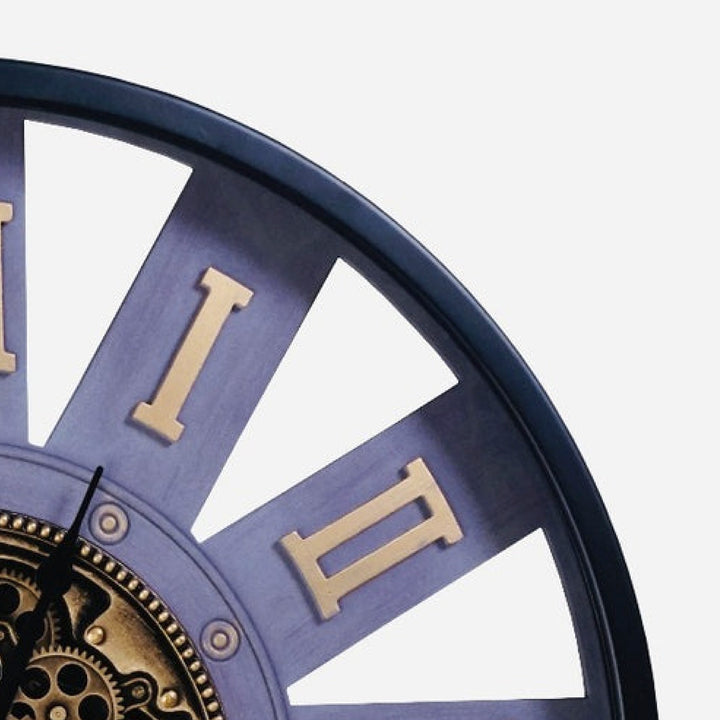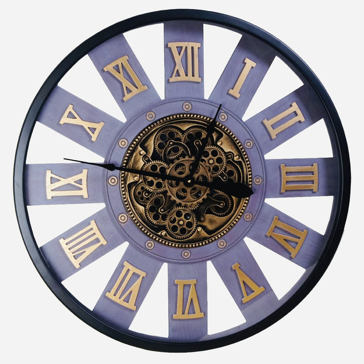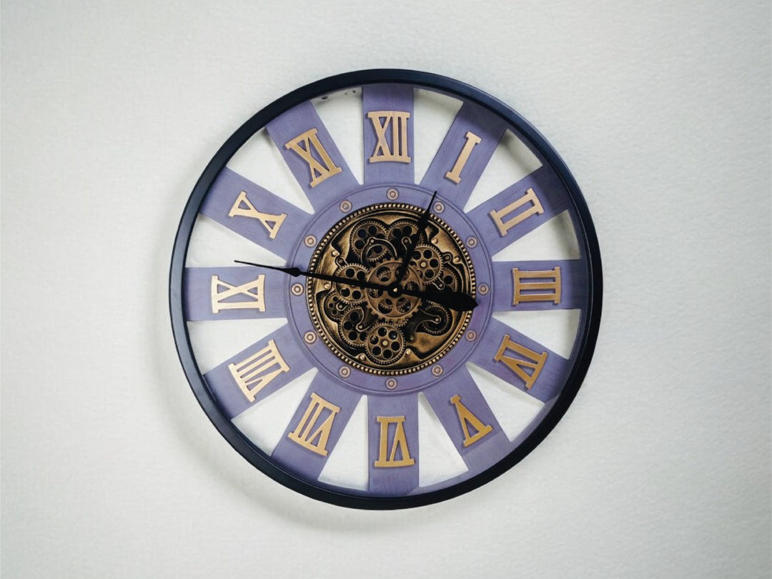 This Moving Gears Clock features a unique industrial-style design, complemented by black and gold colors. The intricate carving of the black and purple metal frame, along with the gold Roman numerals and moving cogs, creates a visually appealing effect. This large wall clock is powered by 3 AA batteries (not included) and features a quiet sweep hand movement to movement to monitor time.