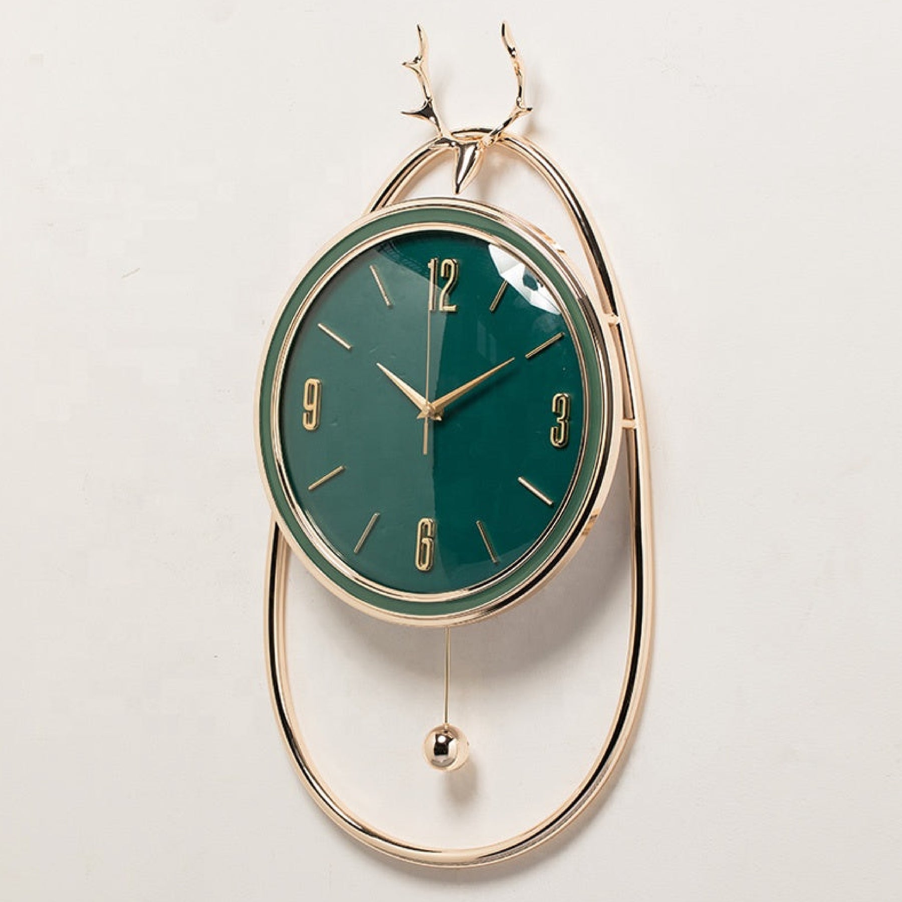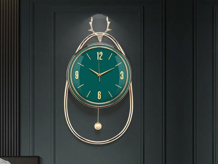 The Sofi Moving Cogs Wall Clock complements modern interior styles with its royal design. Featuring a green frame with gold lining and a graceful deer head at the top, this clock works as an accent piece for bare walls. Its quiet sweep movement ensures a peaceful environment without the ticking sound.
