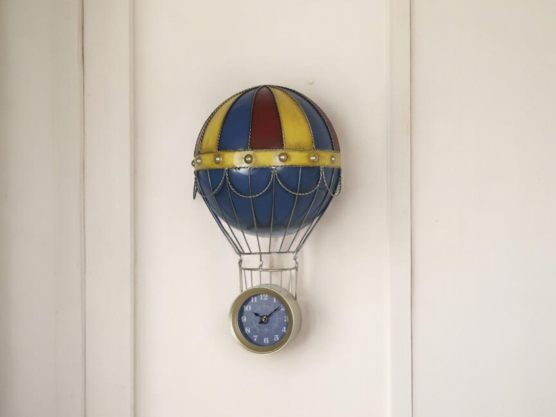 The Air Baloon Vintage Wall Clock is inspired by the design of hot air balloons. This iron clock with muted blue finish and accented with colourful details, creates a playful yet vintage vibe. Its quiet sweep movement make it a charming, noise-free timepiece that fits beautifully in any room.