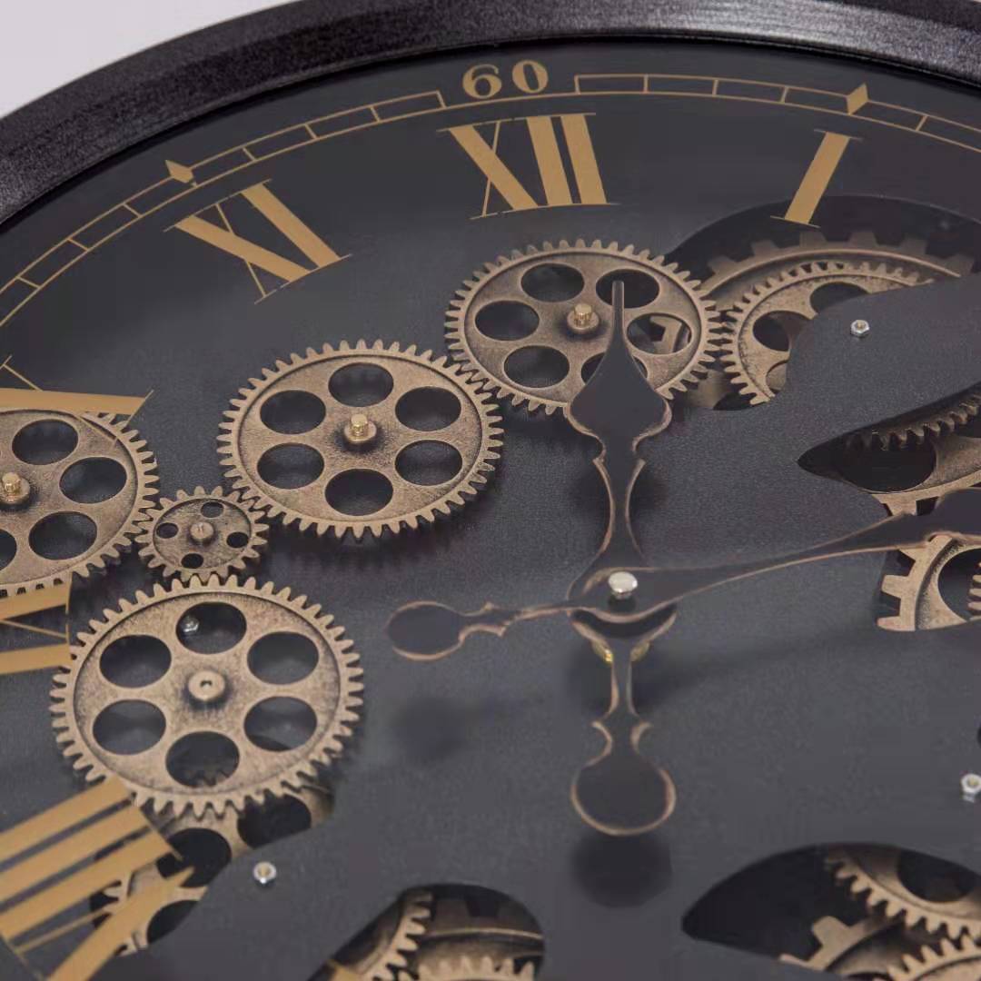 The Vintage Moving Cogs Square Wall Clock exudes grandeur with its royal gold and black color combination. This modern wall clock features a black cut-out metal frame, contrasted by gold moving cog decorations. It is equipped with a non-ticking mechanism to ensure accurate timekeeping.
