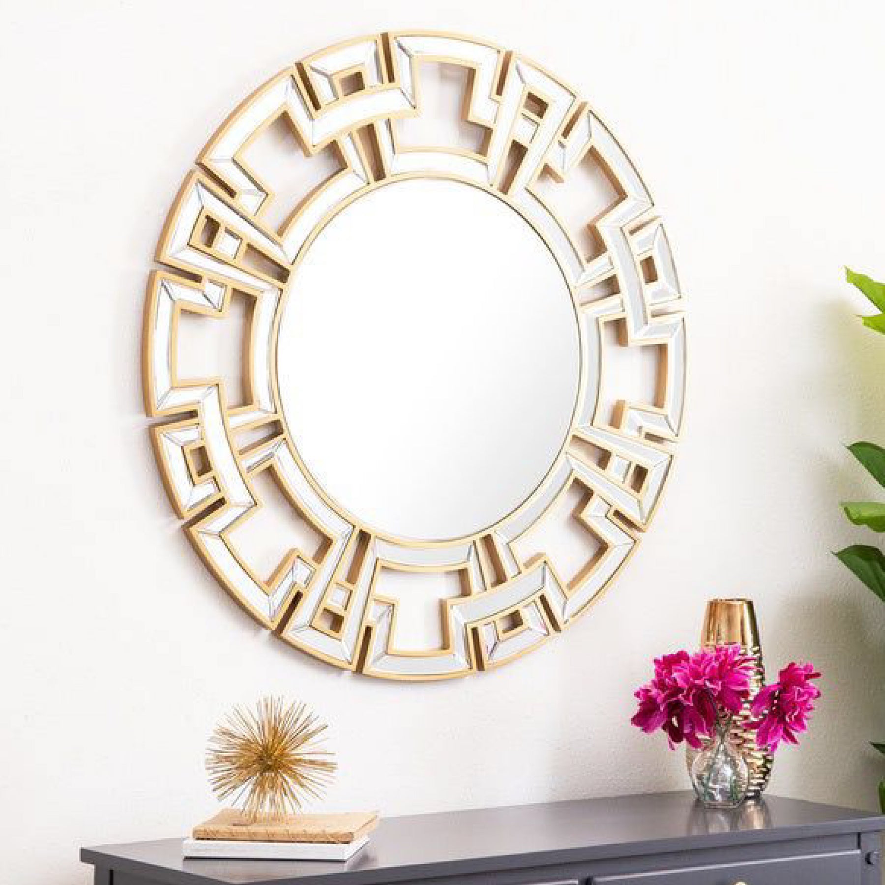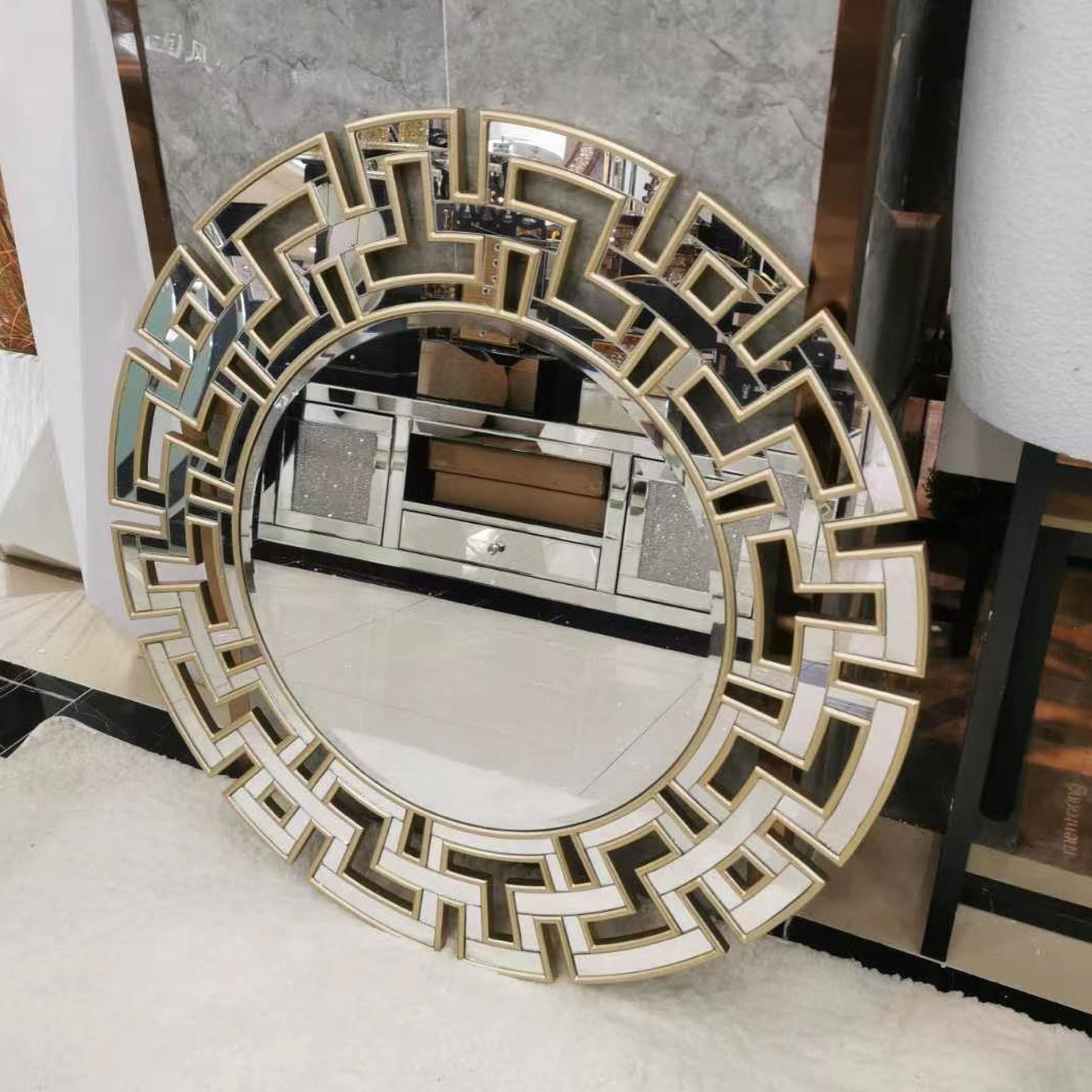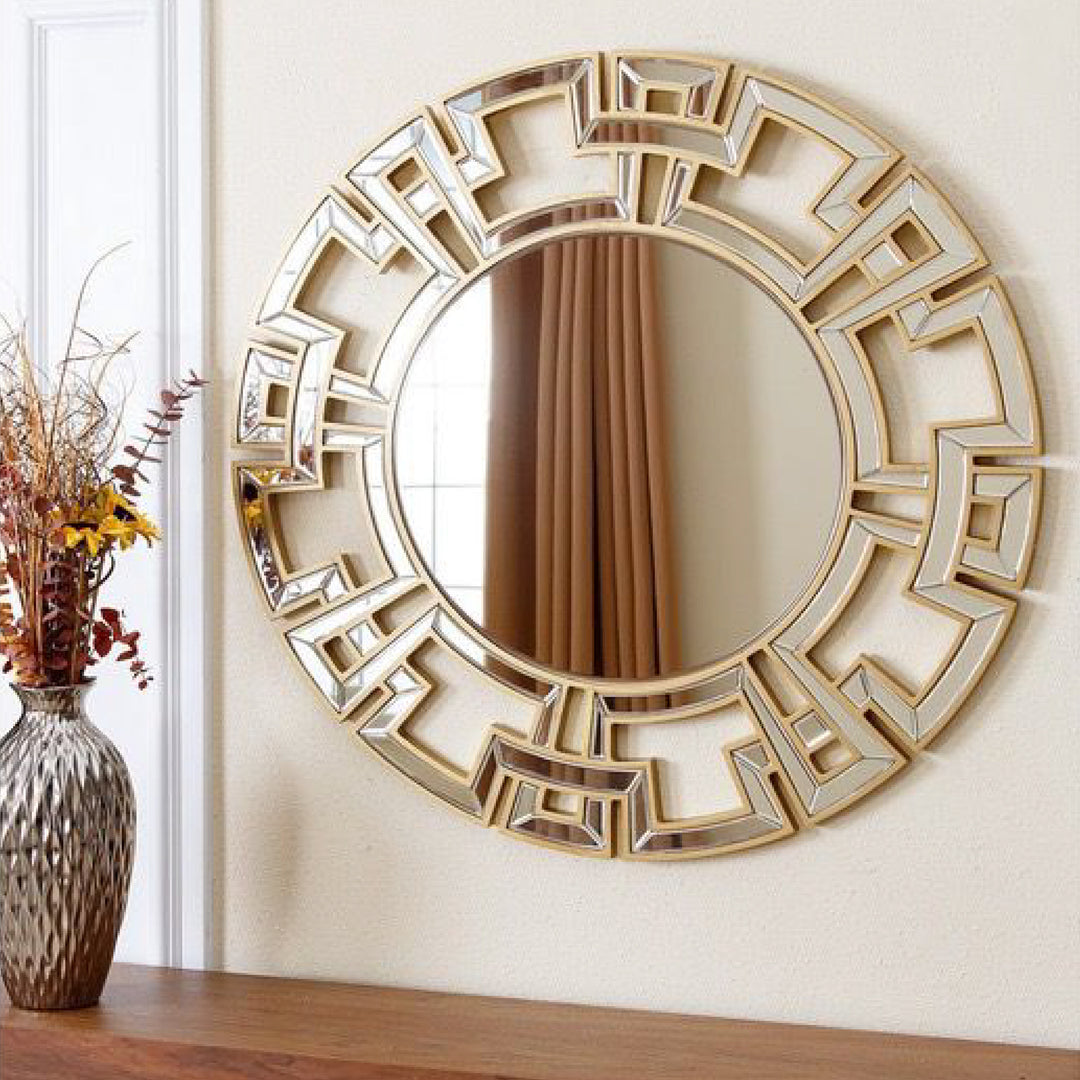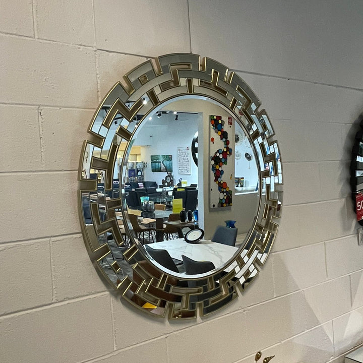 The Gucci Round Glass Wall Mirror creates a magnificent space when hung in the living room or hallway. This high-quality mirror is framed in gorgeous gold/silver metal with detailed cut mirror pieces, forming stunning chained edges. The stepped beveled borders, with a generous 3 cm bevel at the center mirror, offer a modern frame that complements a variety of interior styles.