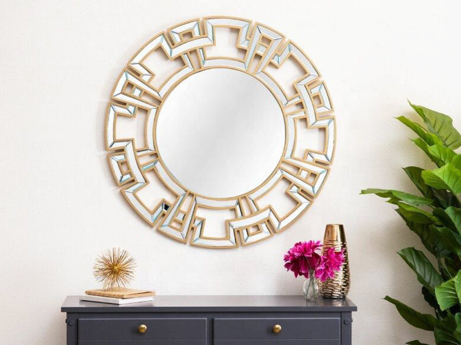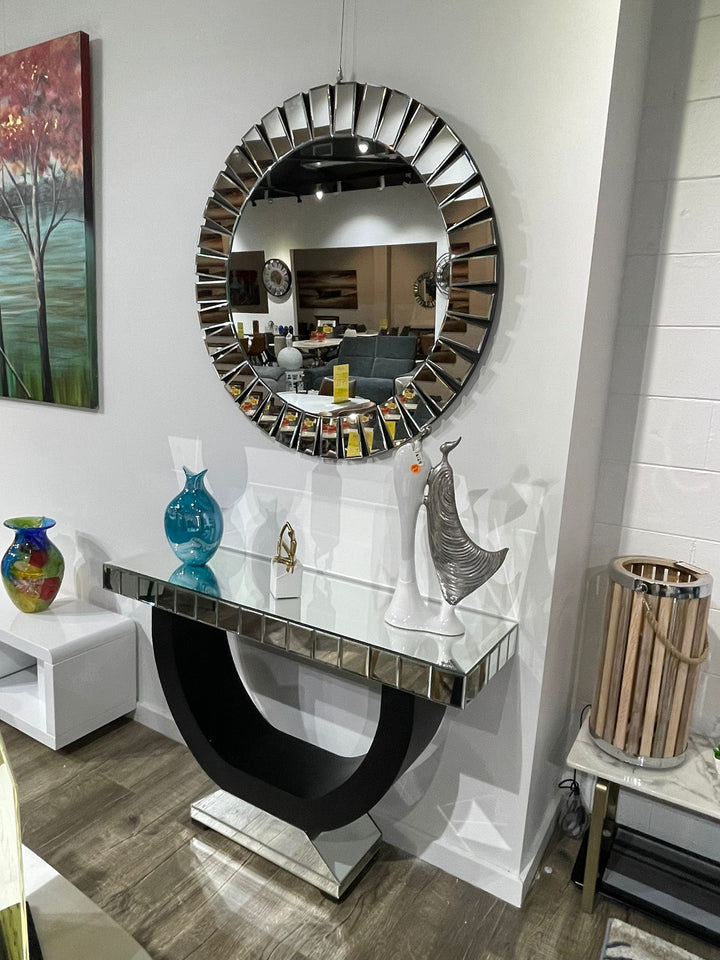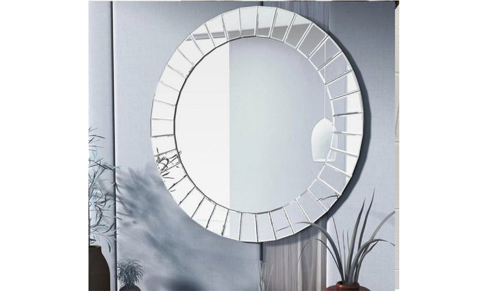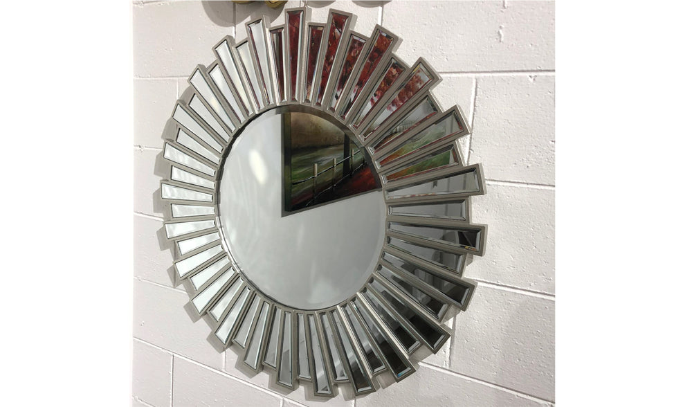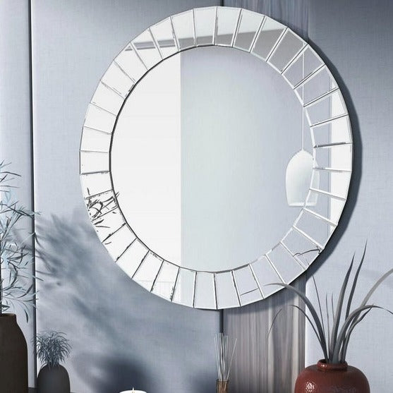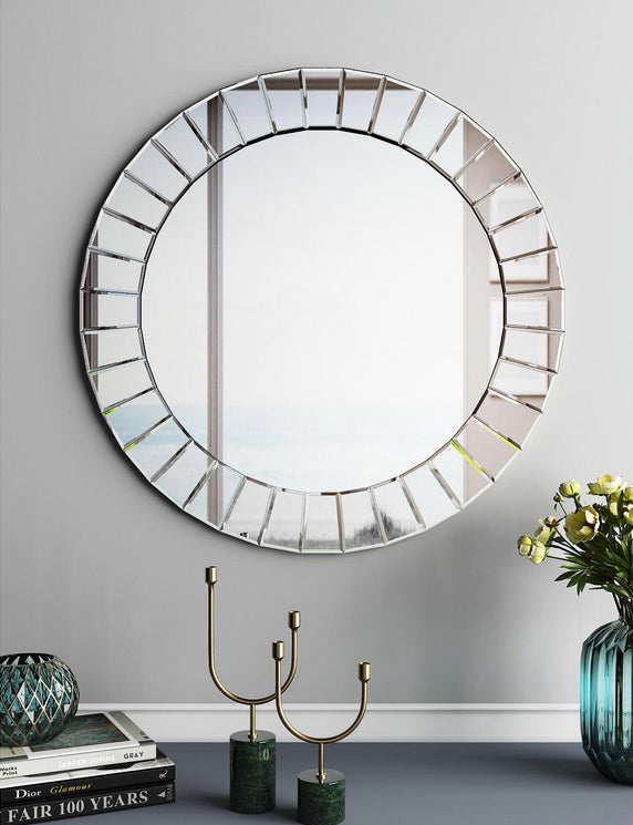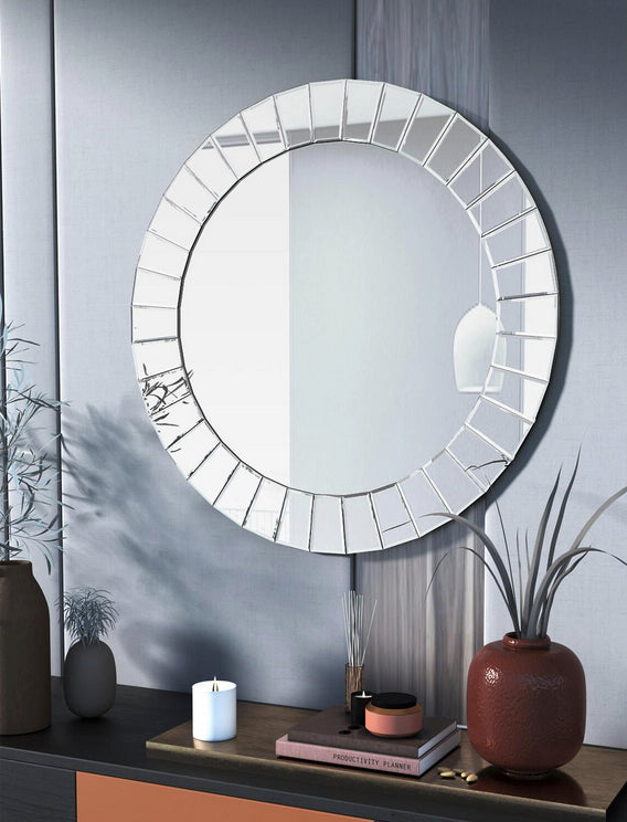 The Hilton Modern Glass Large Wall Mirror in silver adds luxury to any setting. It features a large round mirror at the centre and multiple cut mirrors embedded on a rare wood panel. Made from high-quality glass, it not not only provides a clean reflection but also creates an illusion of more space in your interiors.