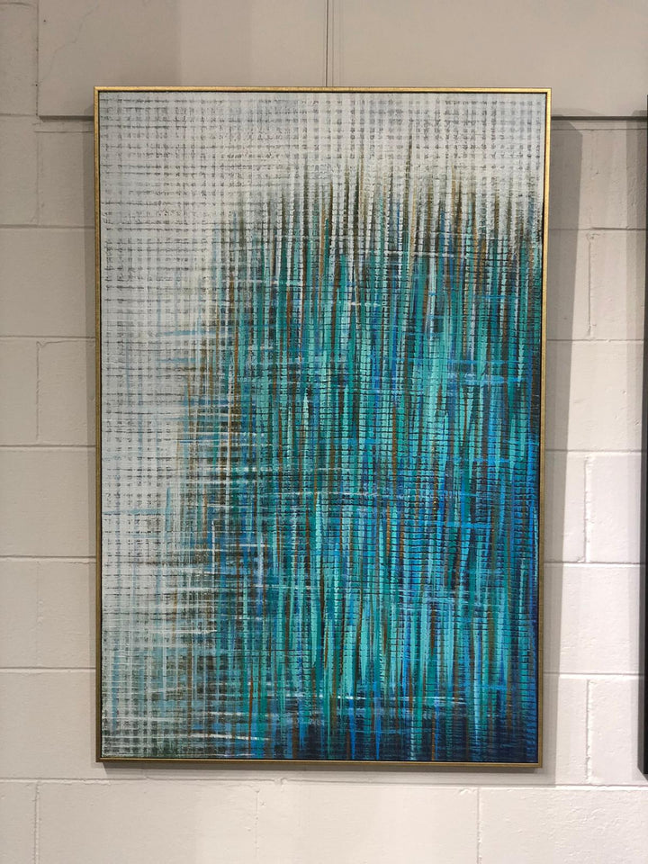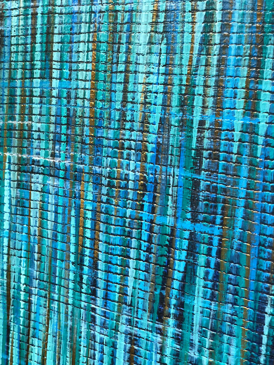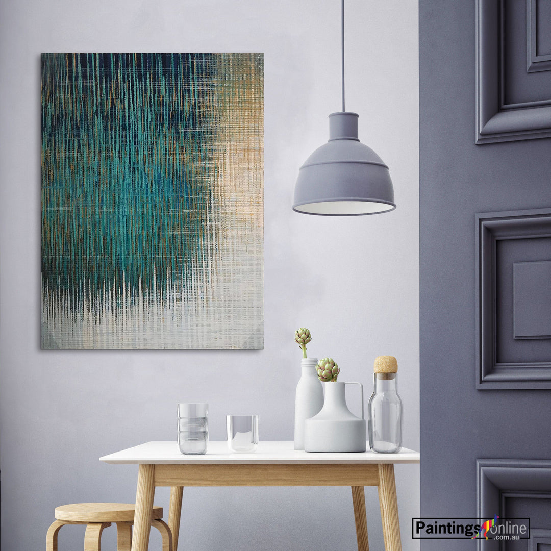 Shapes of gloomy, white, and teal organize a pixelated markings that conveys the complicatedness of the sanity. A downtown, meaningful abstract art piece that glints with intricacy.