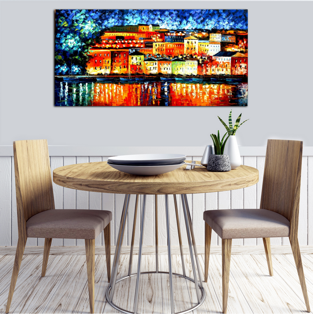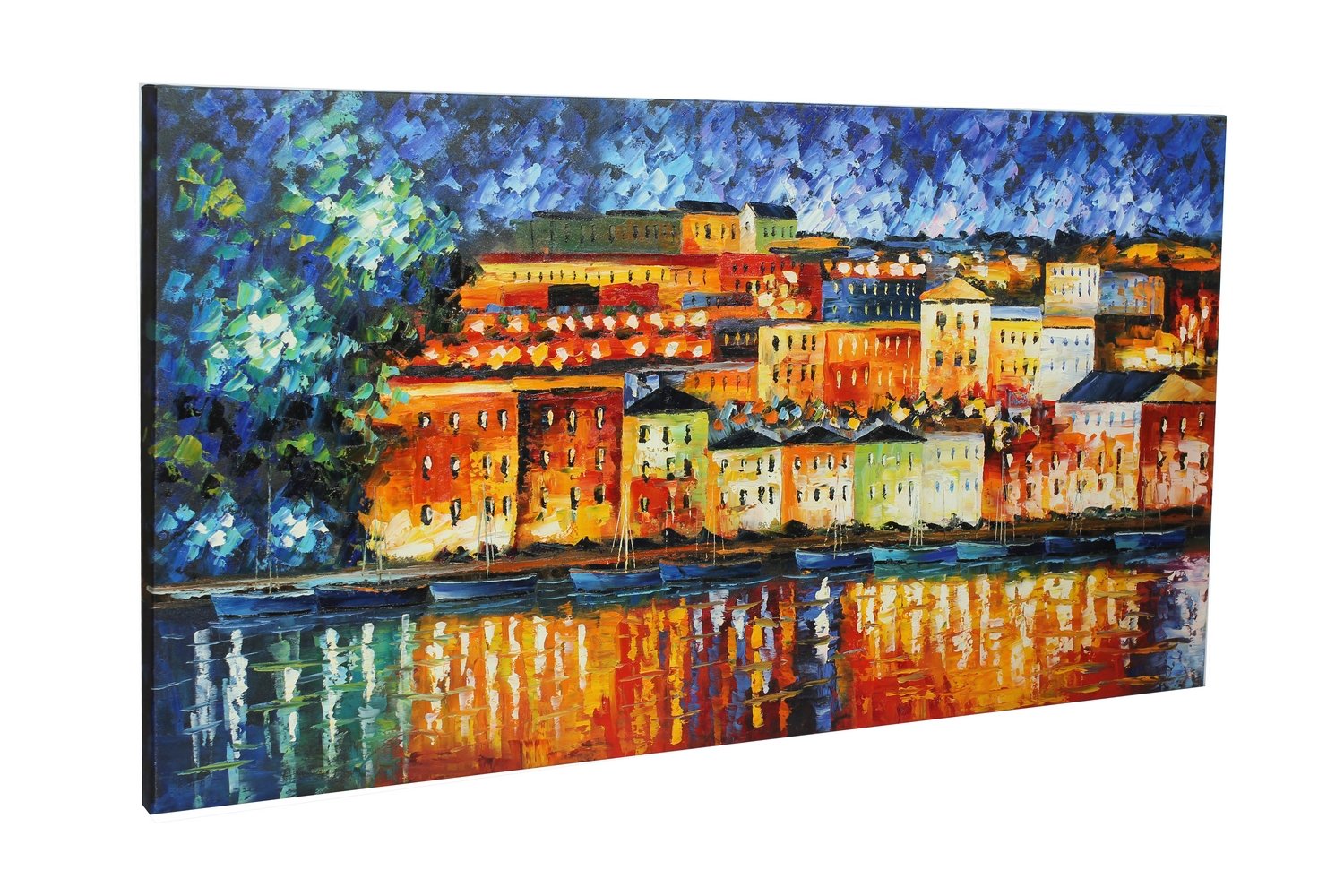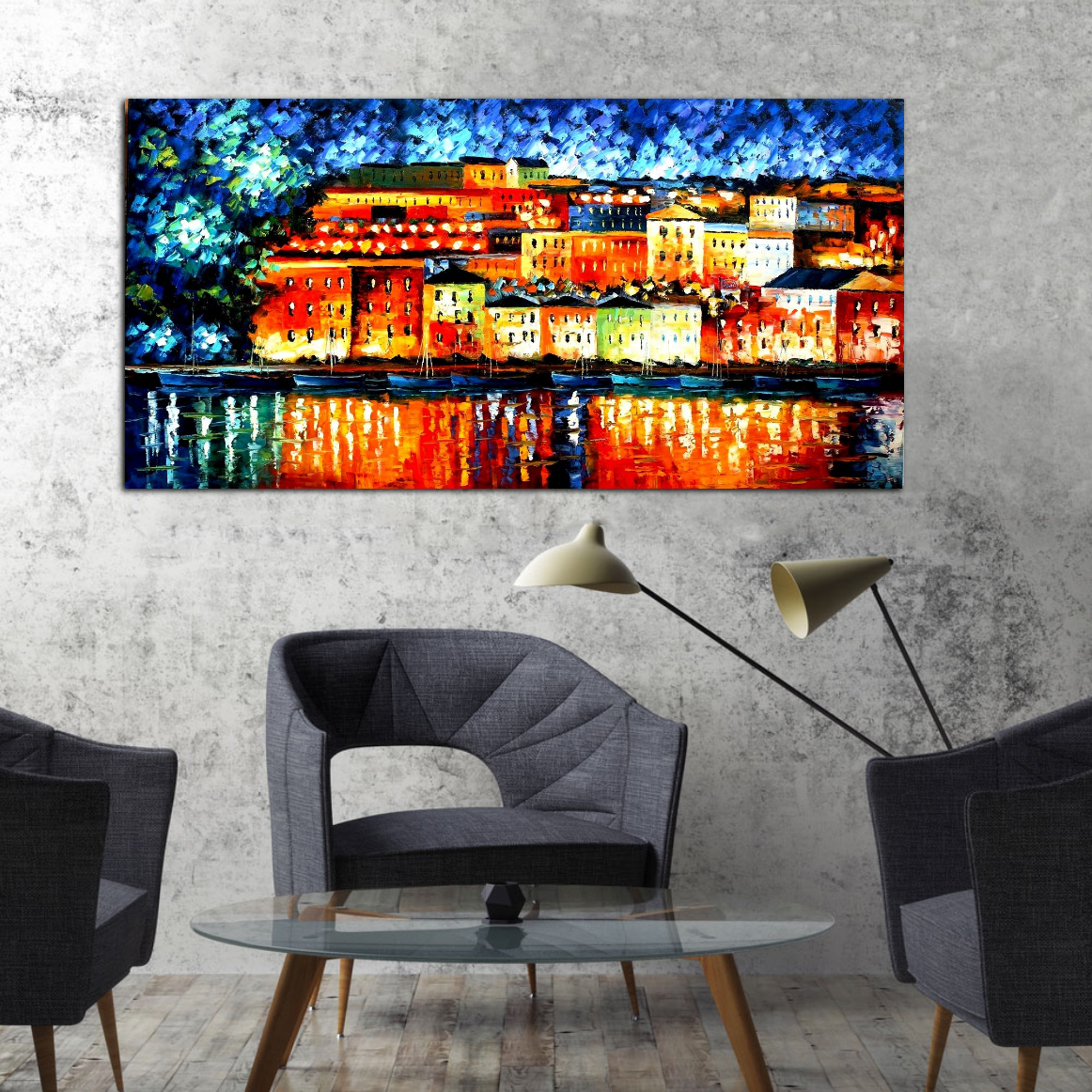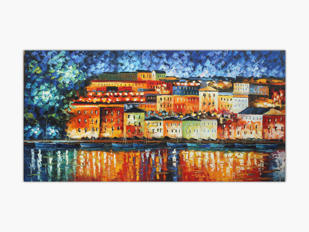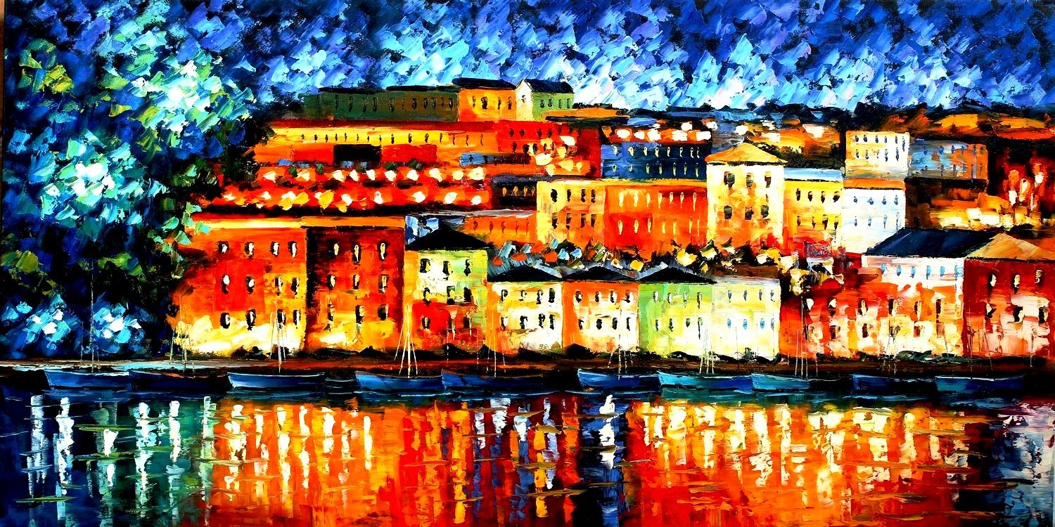 Colorful and inspiring representation of the city life by night. The multi-color city lights are amazingly mirrored into the ocean. Landscape abstract that is pure magisterial work of art.