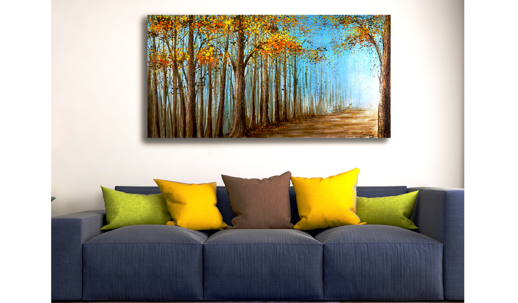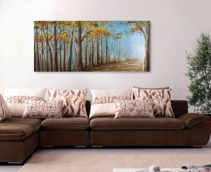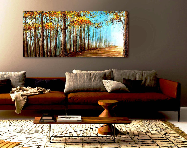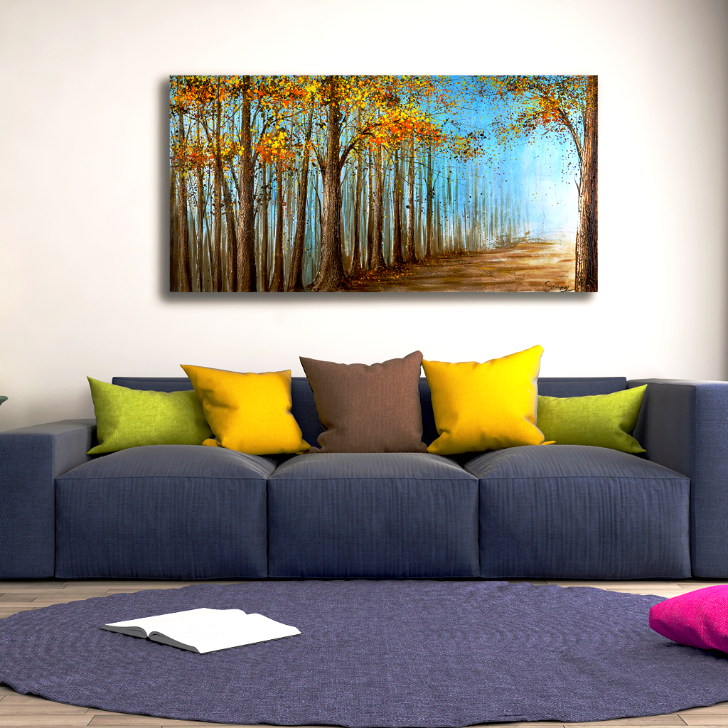 This landscape art piece captures a wondrous path between trees in a kaleidoscope of color and almost secret fragmented light. The spirit of nature and mounting come alive in this stunning nature landscape painting. Add a piece of nature into your home with this wonderful hand painted art piece.