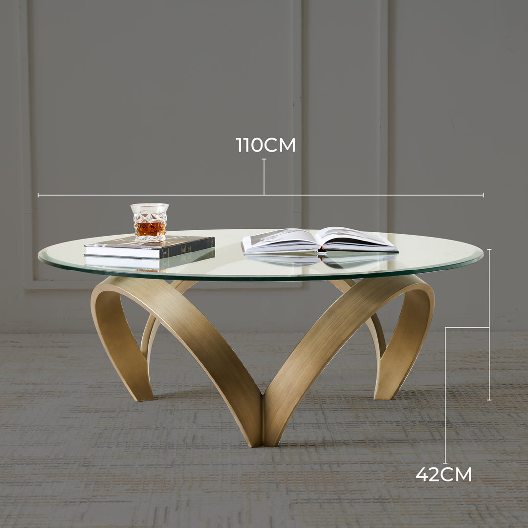 The Alberta Glass Top Coffee Table is an exquisite piece featuring a 12mm round clear glass top with beveled edges. This transparent tabletop offers an unobstructed view of its beautiful powder coated metal base. With its iconic crown-like design and gold finish, this Scandinavian coffee table brings outstanding artistry to your living room.
