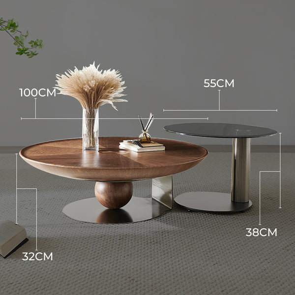 This gorgeous Amazon coffee table features a stained and varnished tabletop in a rich walnut color. The base is finished in a titanium color, showcasing distinctive and eye-catching details. The side table features a tempered glass top, beautifully set on a sturdy titanium base, creating a striking contrast in design and material.