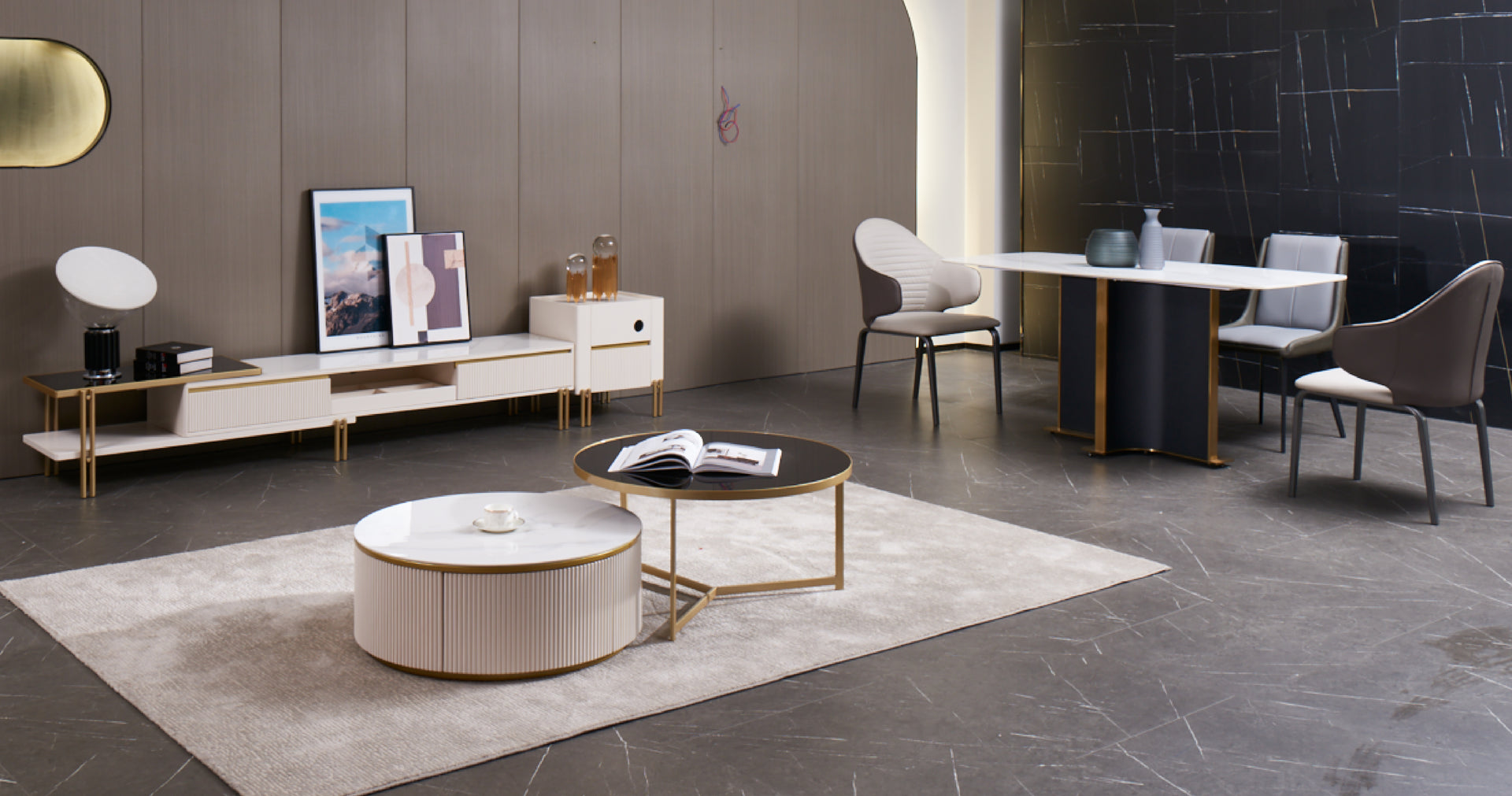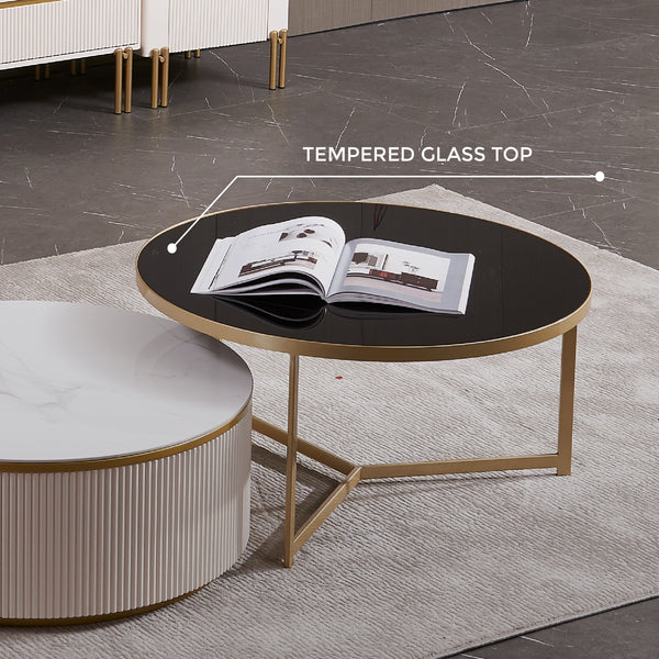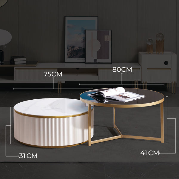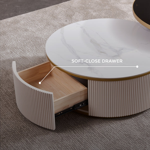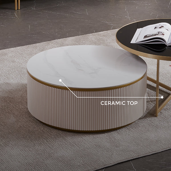 Austin Round Coffee Table Set in Matte Finish with Golden Metal Base, Ceramic Top, and Soft-Close Wood Drawers
