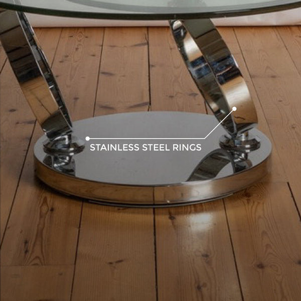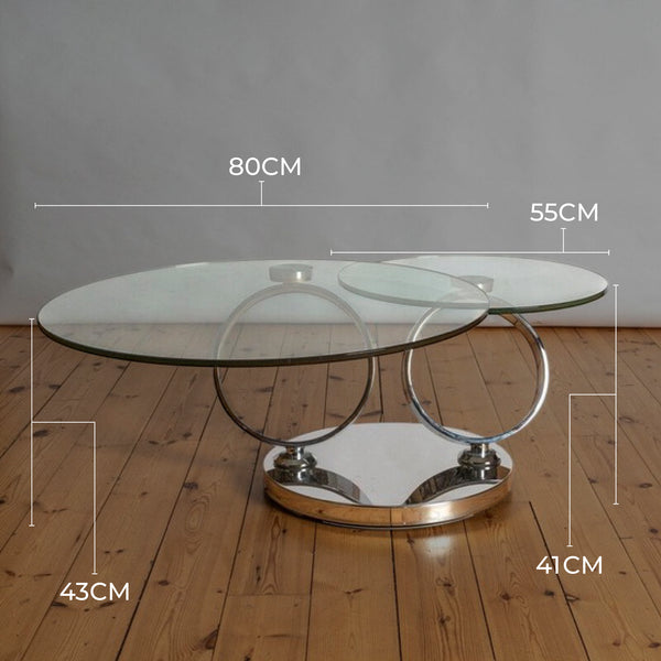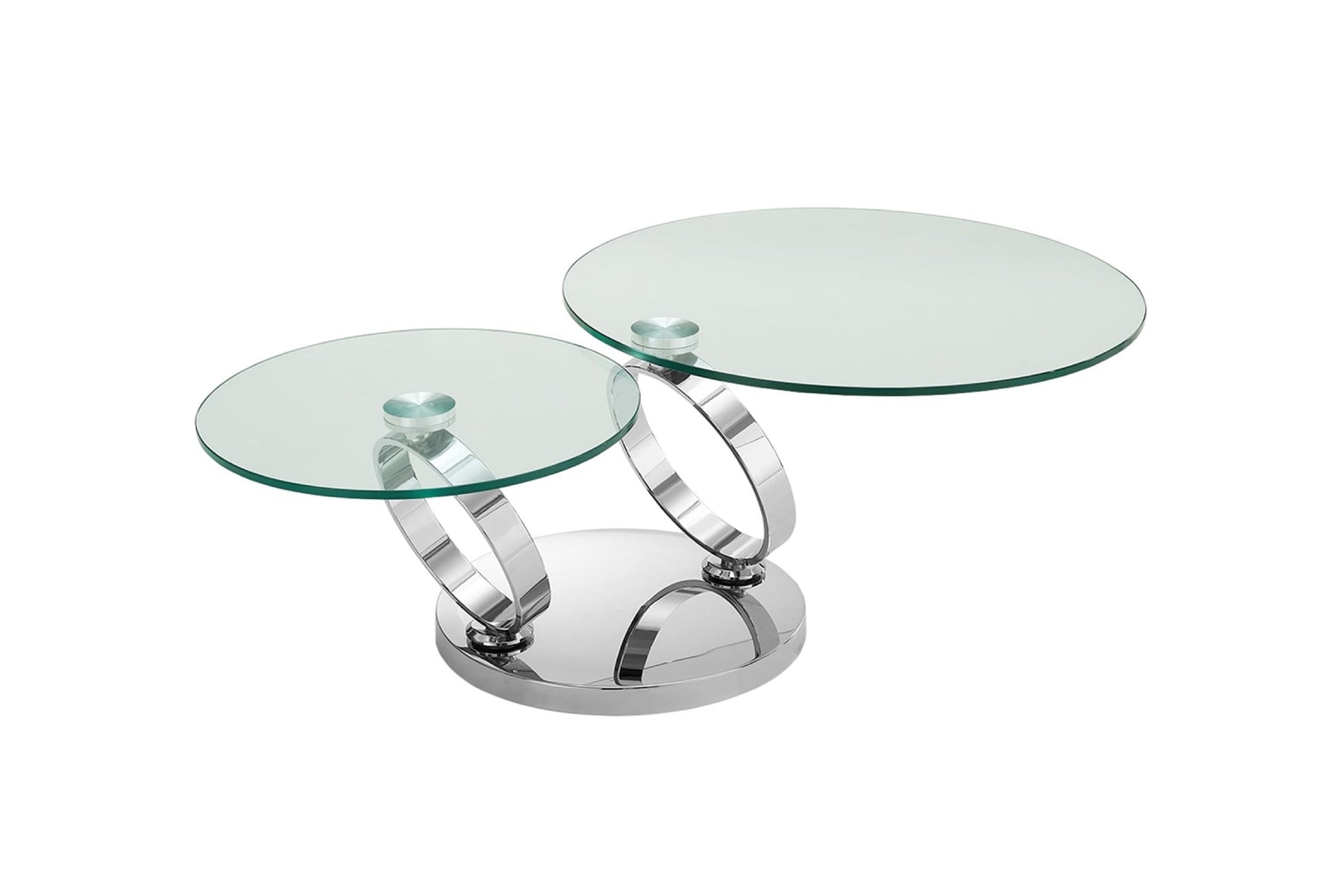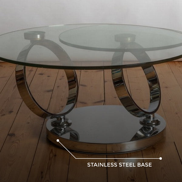 The Avalanche Swivel Glass Coffee Table features two glass tops with a rotatable design, offering versatility. Contrasting the clear glass tops, the stainless steel base in chrome finish and rings design provides a polished look. This versatile round coffee table is perfect for modern interiors, offering an adaptable design.