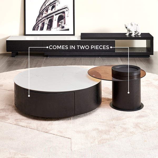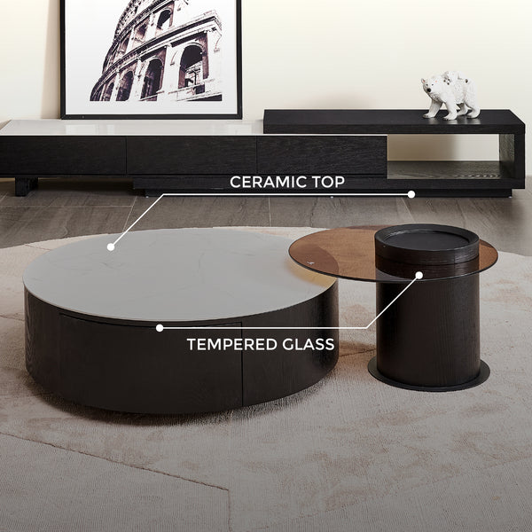 Bahamas Round Ceramic Coffee Table with 2 Drawers & Glass Top Side Table (Set of 2)